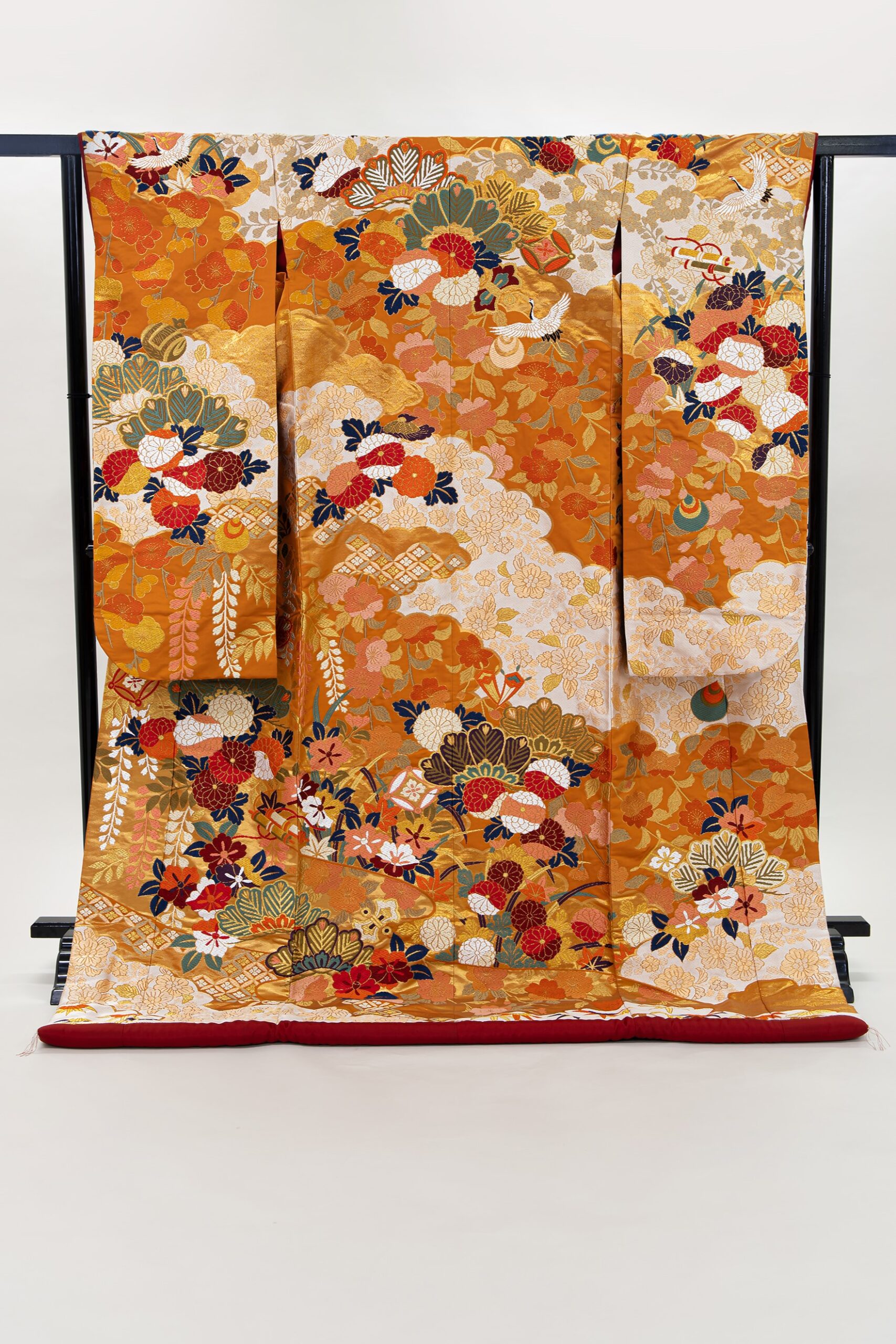 金糸や銀糸などを使った刺繍物 生地に優美な文様を織り込んだ織物 生地に描かれた文様を彩色した友禅物など 熟練した伝統技術が冴える格調高い華やかな姿は お色直しにも人気の着物です。