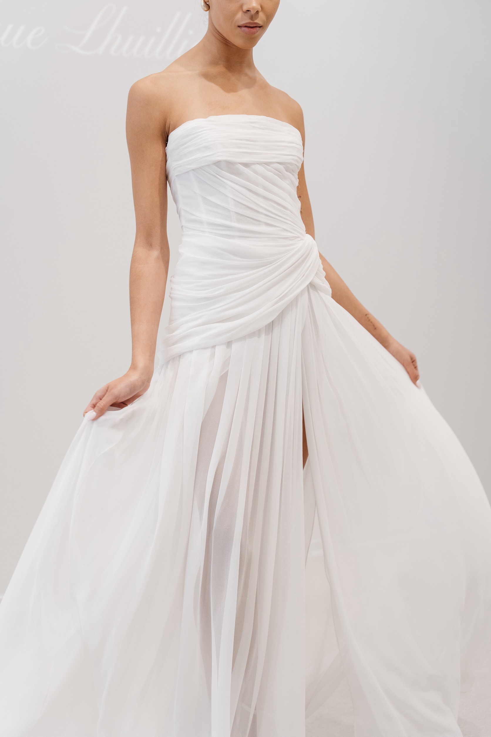 モニーク ルイリエ/風のゆらぎを感じるような軽やかなシフォンは花嫁の動きによって魅力を増す。ドレープを生み出すタックテクニックは、職人技なしでは語れない。