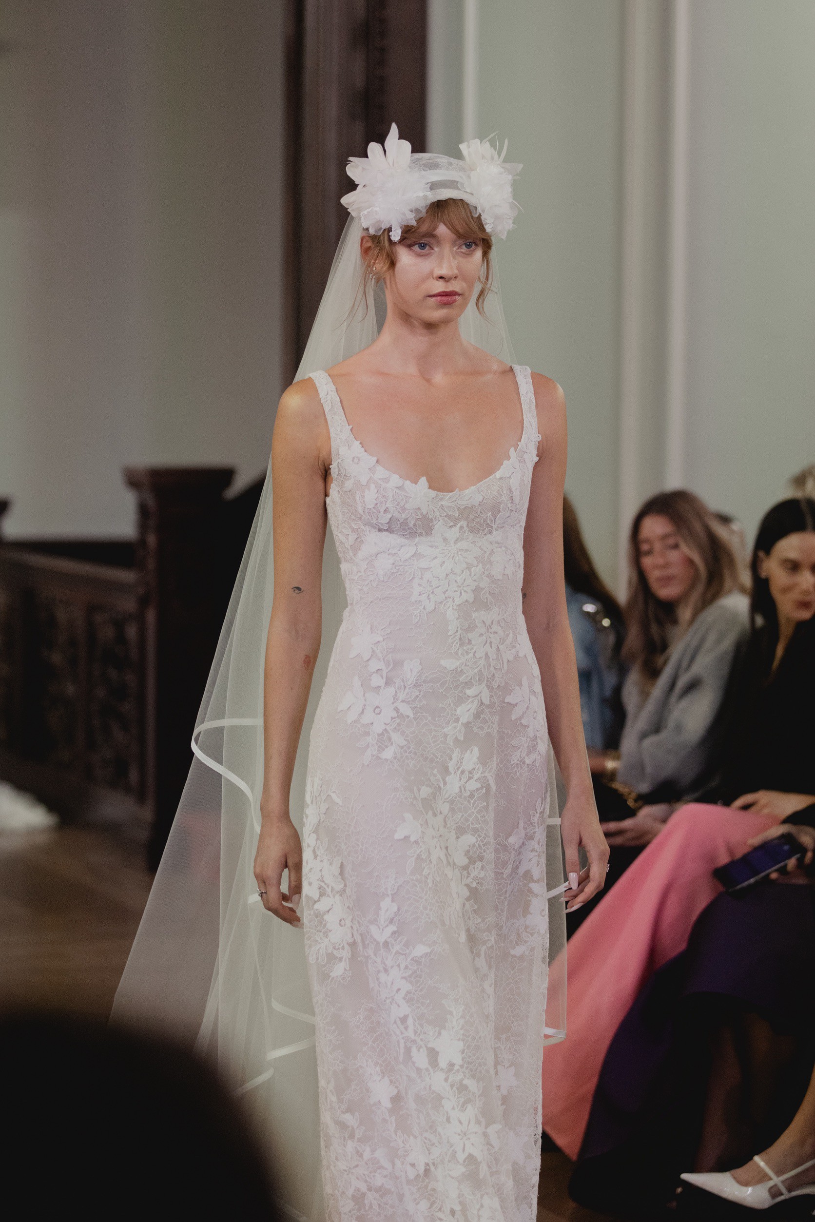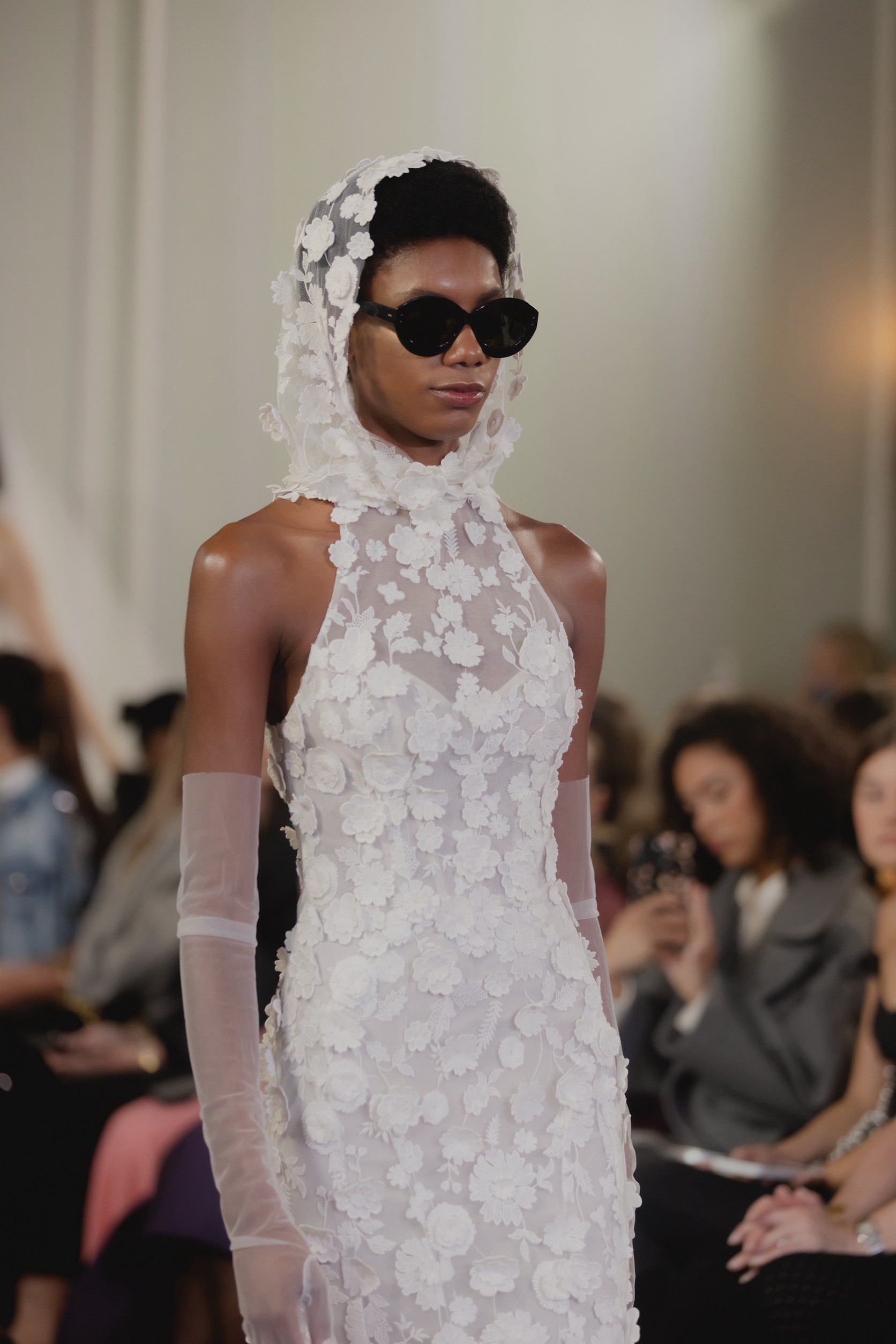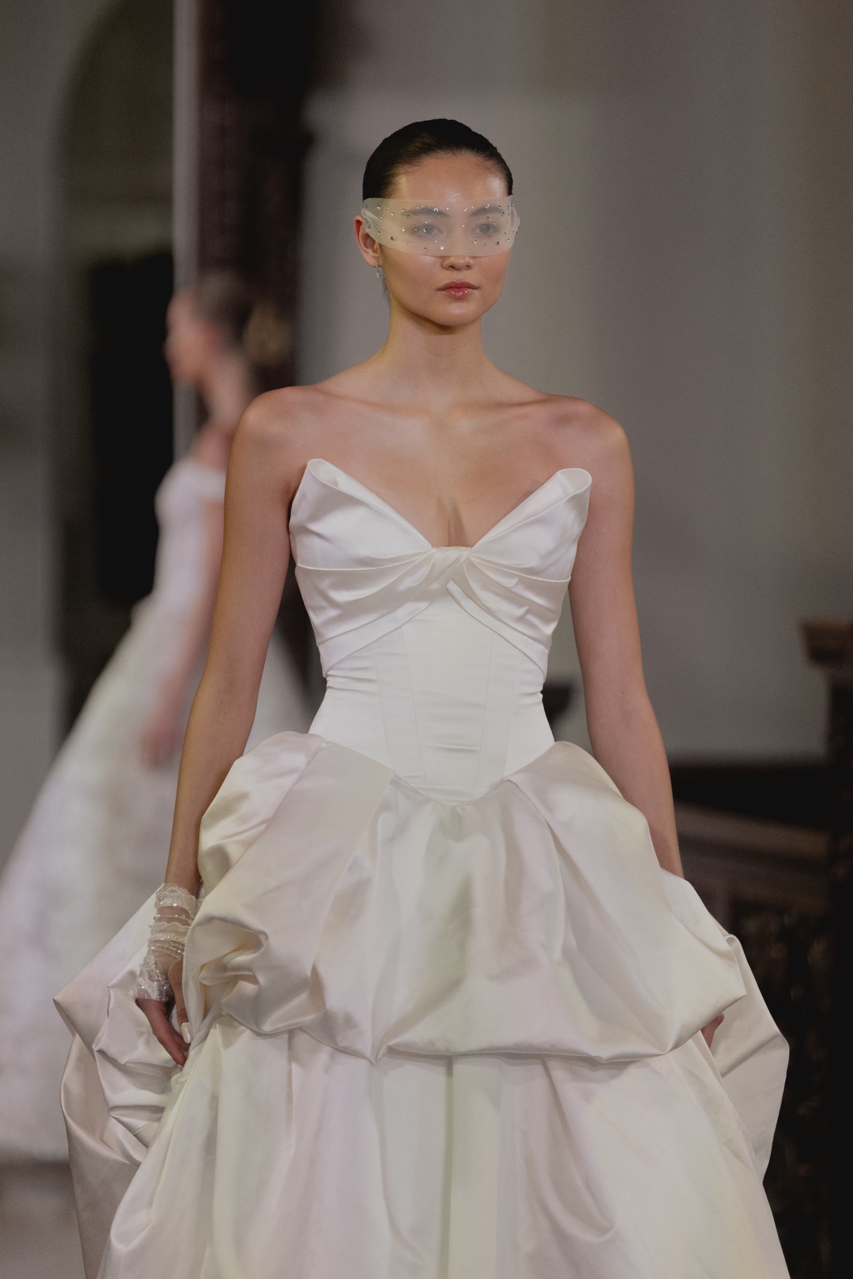 モニーク ルイリエ/ミニマルなドレスに主役級のヘッドピースとベールを合わせた。透明感のある生地をかいつまんだコーディネートは圧巻
