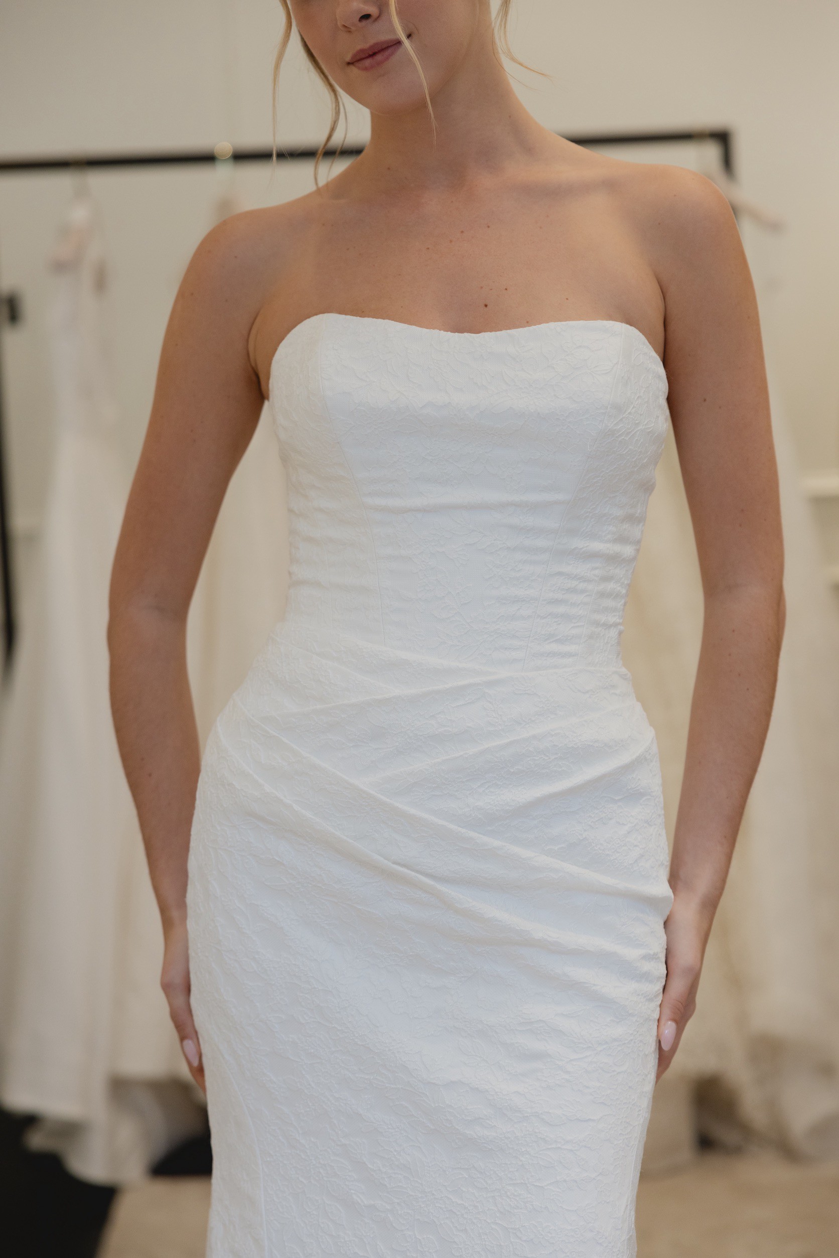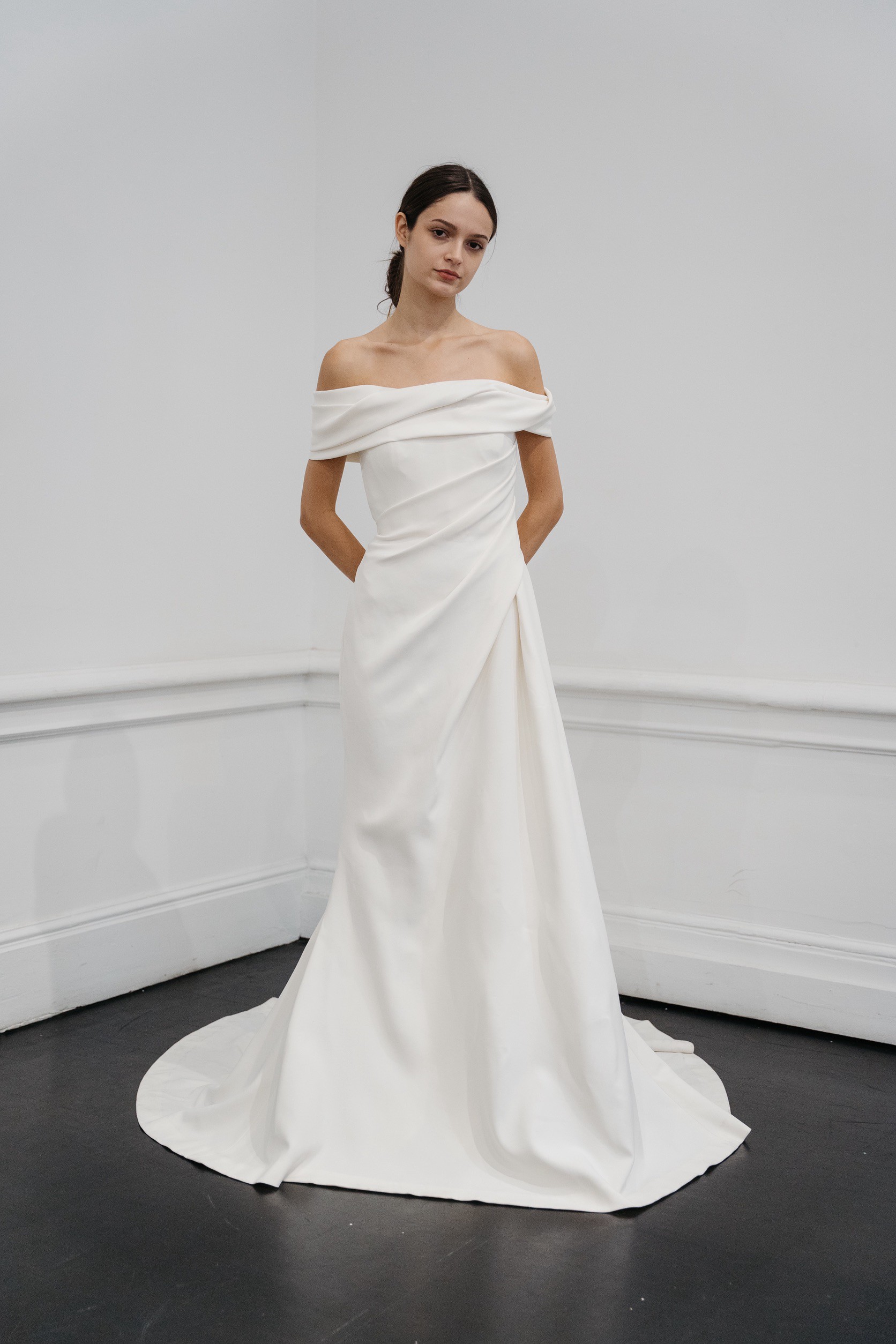アパレルにおいてもドレープのデザインは今シーズンのキーワードであり、リアルクローズでも、トップスやスカートにドレープのはいったデザインを取り入れていらっしゃる方も多いのでは。ブライダルに置いても、柔らかく上質な素材でドレープを取り入れたドレスが多く見受けられました。特にスレンダーラインや、マーメイドラインなどのタイトなドレスの腰回りやヒップを覆うようにドレープされたデザインが印象的でした。