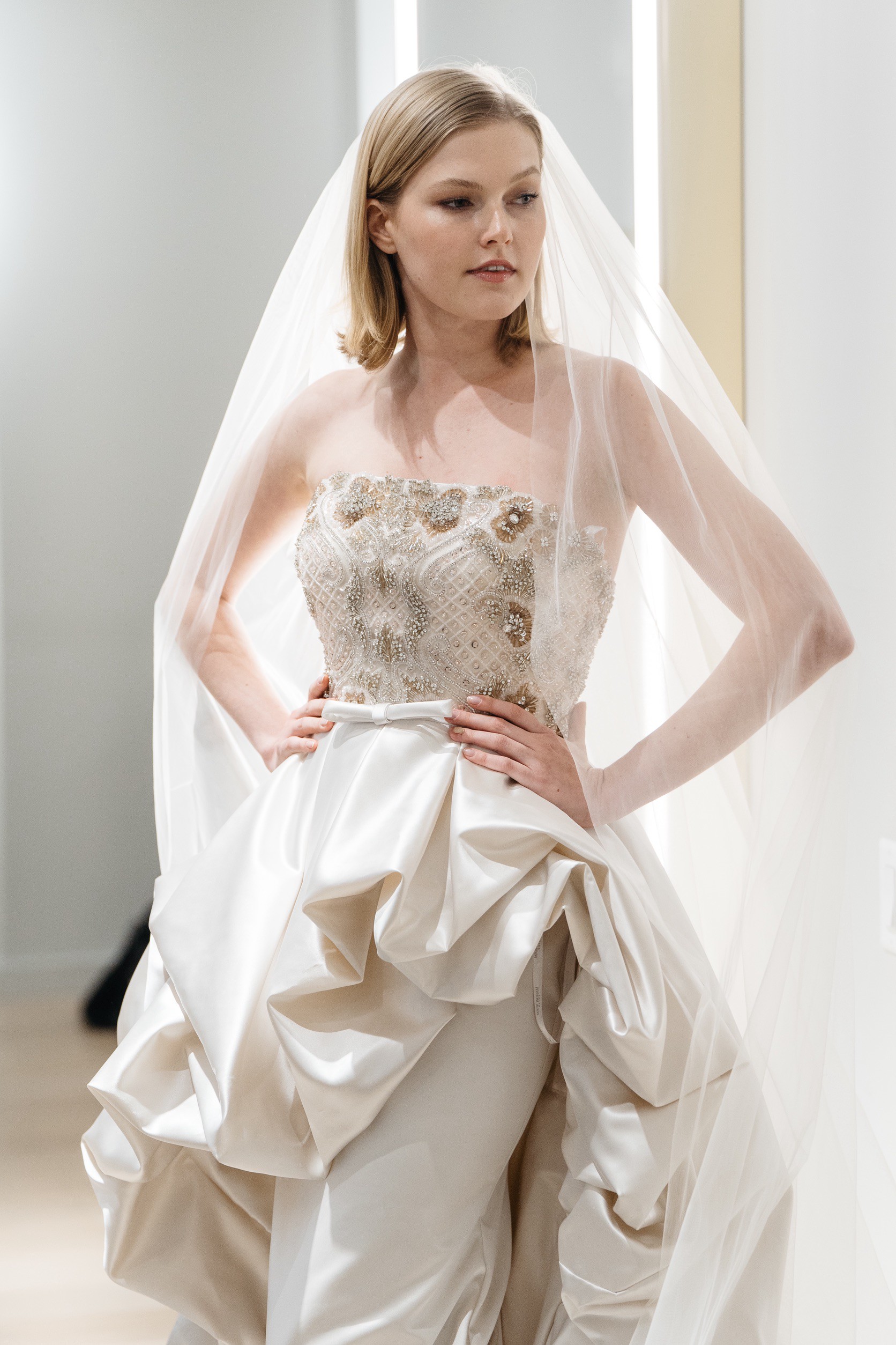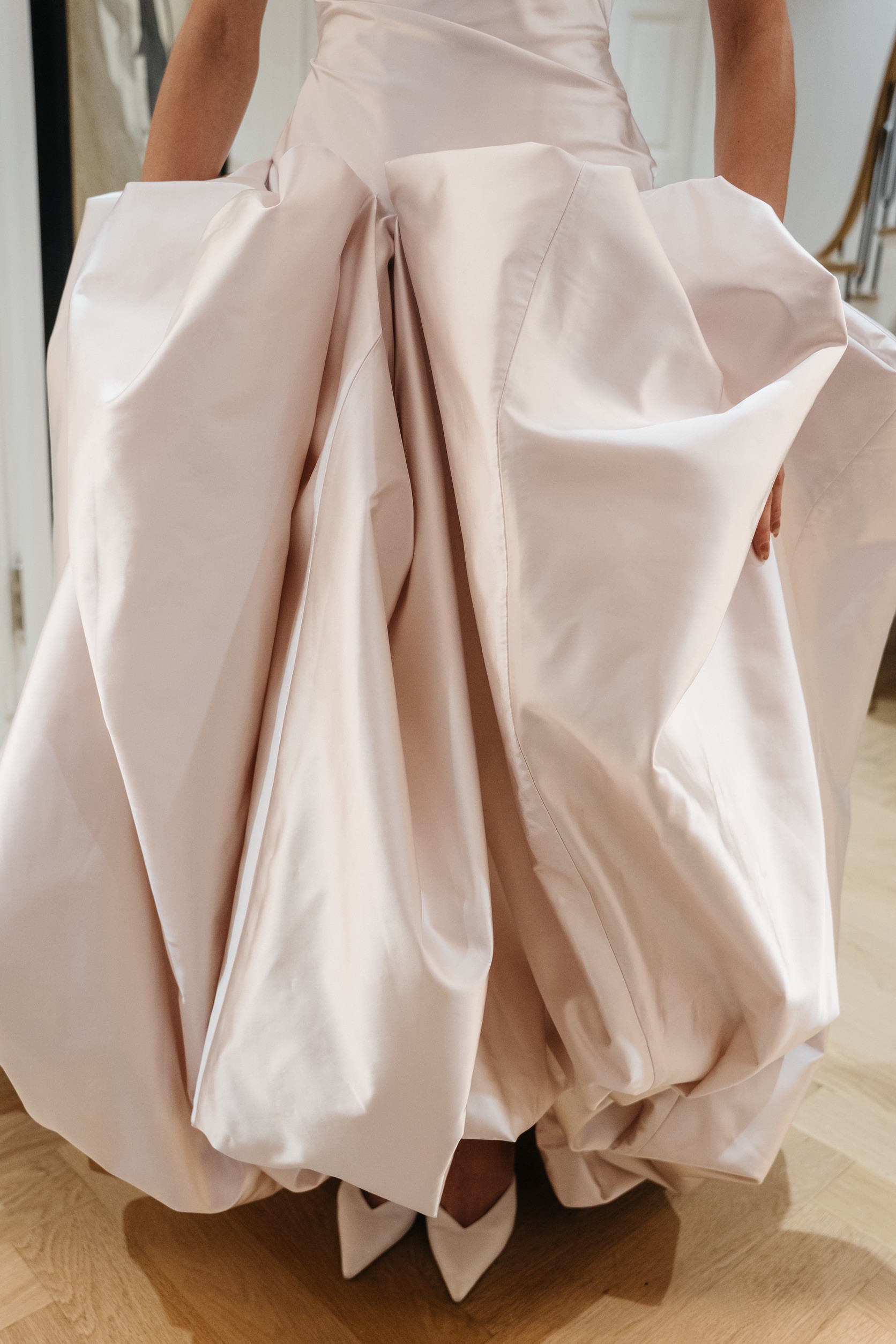 マーク イングラム/80年代を彷彿とさせるシャンパン味を感じる色と胸元のビージングをオーバースカートをバルーンにすることで、ゴージャスでロマンティクな解釈に。