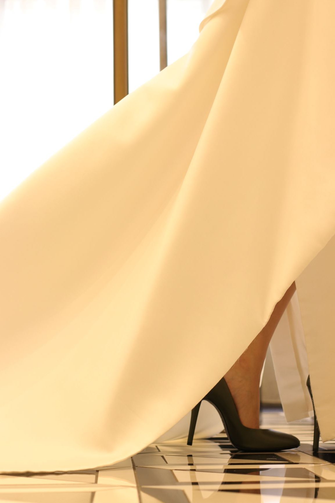トレンド感のあるスリットデザインには、自分らしいお洒落なウェディングシューズを合わせ、他の人とは被らない心から愛せるスタイルでゲストの注目を集めます