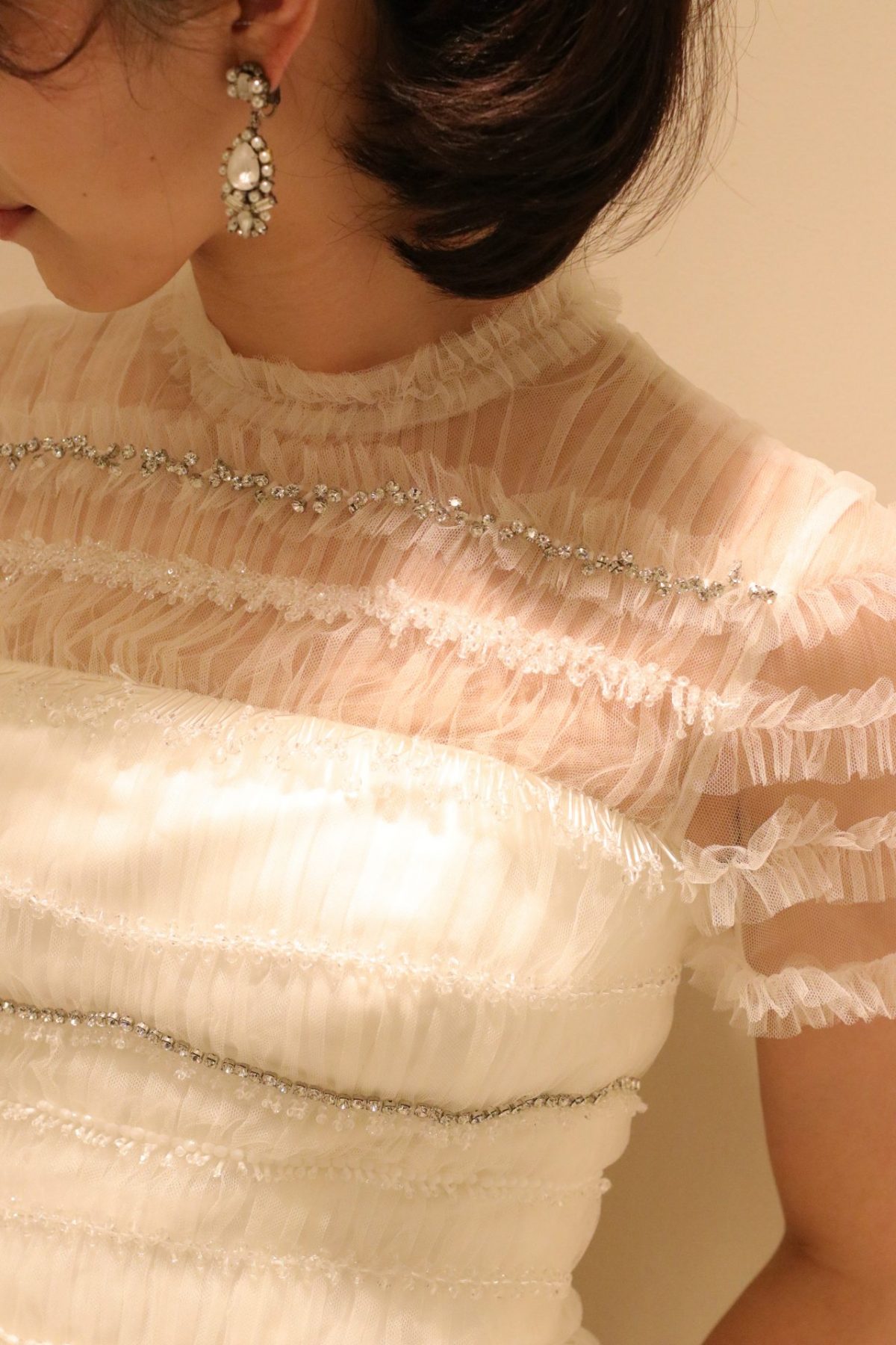 繊細なギャザーの上に首元から腰にかけて施されたクリスタルはまるで氷柱のよう。エレガンスを感じる美しいシルエットのなかに、さりげなく宿るクリスタルの儚げな表情が魅力的な1着です。