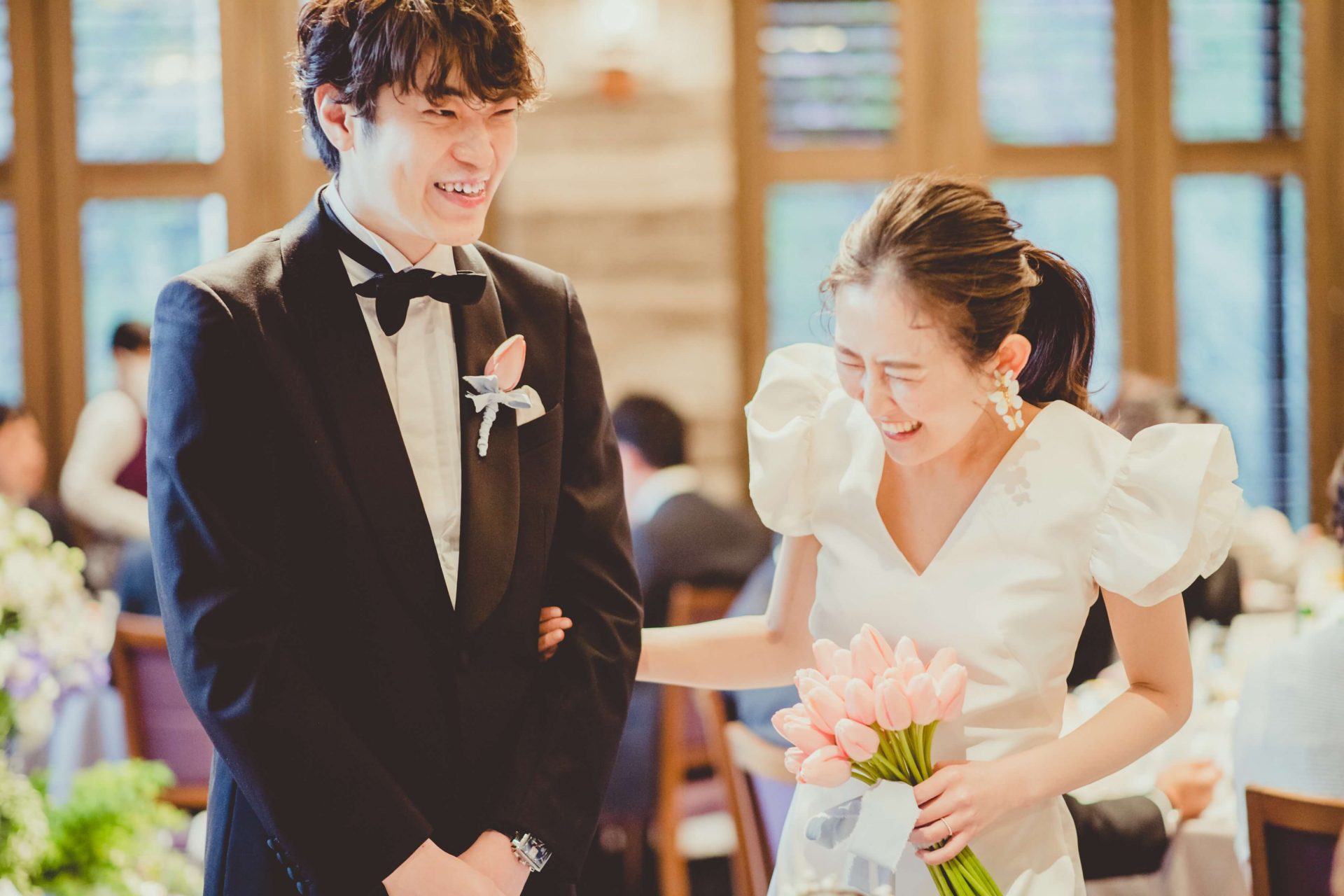 穏やかな陽の光が降りそそぐ披露宴会場。トップから流れるように咲くシークインレースはご新婦様の動きに合わせ、きらきらと奥ゆかしく優美に煌めきます。降りそそぐ自然光とのマリアージュは、なんてロマンティックなのでしょう。近しい距離で過ごすことのできる邸宅ウェディングだからこそ、その繊細さはゲストの目にも留まったはず。春の可憐で愛らしい会場装花がより一層お二人の和やかなパーティーに彩りを添え、幸福感に満ち溢れたお写真に思わずうっとりしてしまいます。