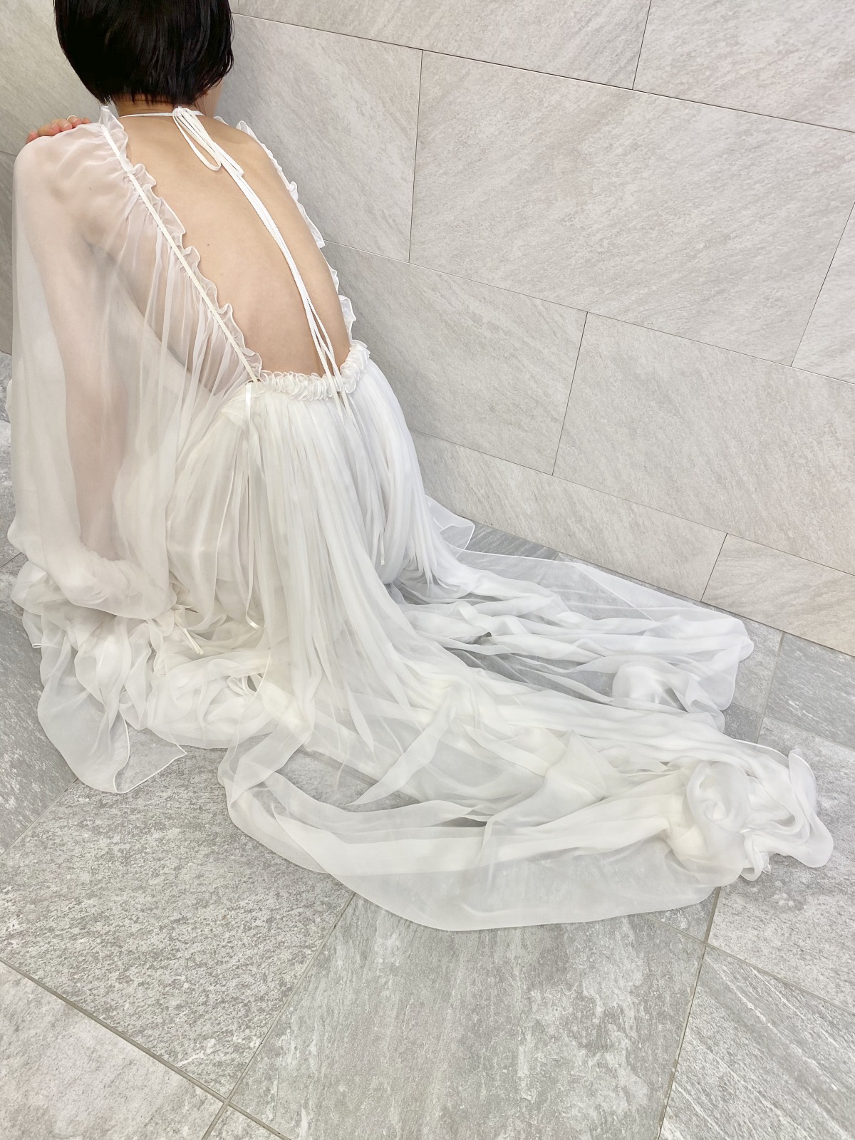 重量を感じさせない軽やかさは、ご新婦様に更なる透明感を与えます。よく見ると、Vネックや手首、振り返ると背中に細いグログランのリボンがさりげなく覗き、柔らかなシフォンの中のスパイスに。バックにイメージできるのは、ガーデンやリゾート。なのにどこかラグジュアリーでゲスト魅了するこちらのドレスは、是非体感していただきたい一着です。