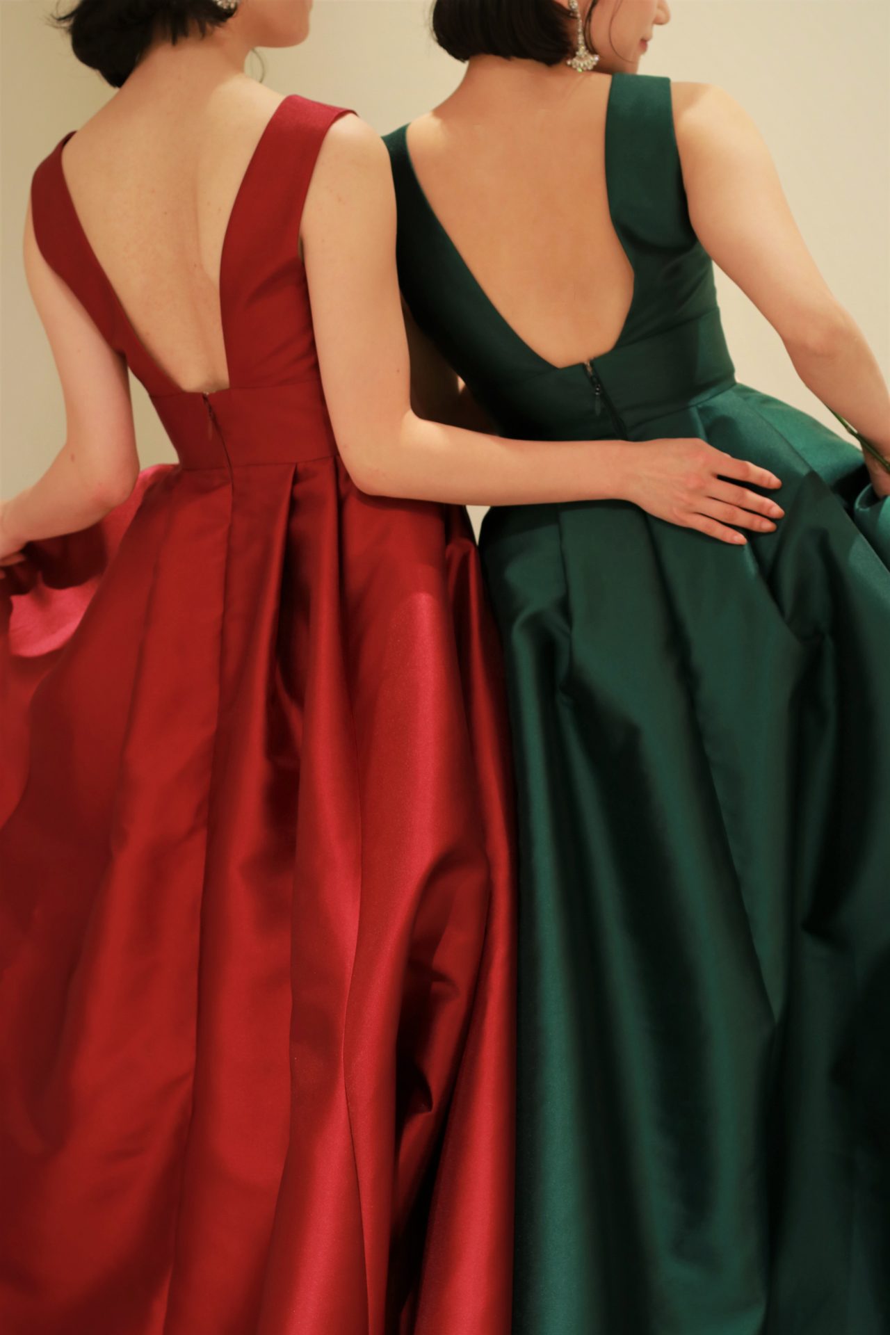 トリート メゾンの2021 Pre collectionより届いた新作カラードレスの数々。その中でもシックなカラーリングが目を惹くサテン地のドレスは、深みのあるグリーンとボルドーの2色展開です。日本の花嫁に懸念されがちなVカットのデザイン。それを胸元の丸みに合わせてカーブさせることで、安心感をもたらしました。凛とした上品さの中に、誰もが自信を持ってお召しいただけるデザインに仕上げられるのは、日本人女性の体を熟知したトリート メゾンならでは。裾もとにかけてふわっと広がる王道な印象のAラインを、胸元と背中のシャープなカッティングで締めることでモダンに昇華させます。パールのようなマットな光沢が美しいファブリックは、自然光や会場のライティングのもとで主役の輝きを与えてくれることでしょう。