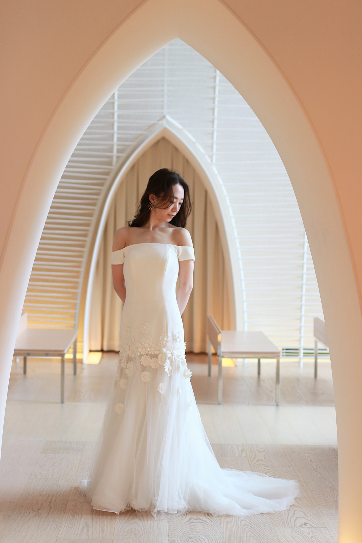モダンでシャープな雰囲気がありながらも、温もりを感じるパレスホテル東京のチャペル。そんなチャペルでの前撮りにおすすめしたいのはVIKTOR&ROLF MARIAGE(ヴィクター アンド ロルフ マリアージュ)のソフトマーメイドラインのウェディングドレスです。ヒップラインまでは厚みのあるクレープ素材が優しく身体に添い、花嫁のボディラインを立体的に浮かび上がらせます。チュール素材のスカートは、チャペル内の優しい光とご新婦様の動きにより命を吹き込まれたかのようにエアリーな表情を見せるのです。オフショルダーラインのシャープさとスカートの軽やかな柔らかさが融合したデザインは、女性として内に秘める芯の強さと凛としたしなやかさを演出。スカートには愛らしいデイジーモチーフがまるでお二人を祝福するかのように咲き誇り、花々の中心に施されたクリスタルはチャペルの光を浴びて、優しく繊細に煌めきます。どこかモダンで都会的な高いデザイン性により、思いがけないエレガンスを創造するヴィクター アンド ロルフ マリアージュのウェディングドレス。身に纏えば、ヴィクター アンド ロルフ マリアージュらしい遊び心あるスパイスによって上質だけれど飾らない、あなたらしさを存分に引き出す前撮り写真を残せるはず。今だからこそ残していただける、もっと自由で等身大の花嫁姿を残してみてはいかがでしょう。