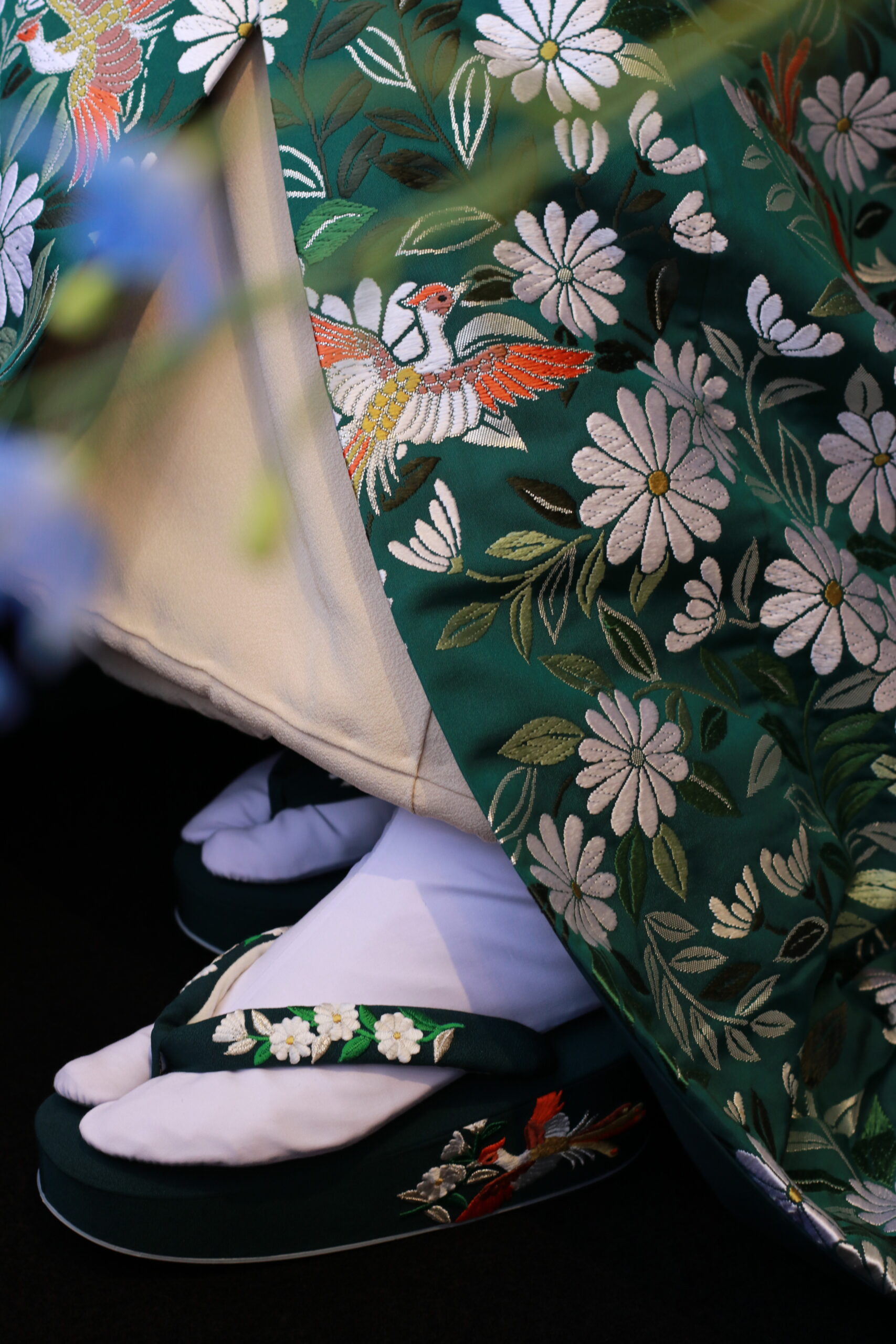 半衿と掛下は、色打掛に使用されている銀色とは反対に温かみのある金やベージュを用いることで、モダンさの中にも花嫁らしい幸福感のある印象に。胸元に合わせる5点セットのお小物も拘ったアイテムのひとつ。潔く白一色に纏めることで、トリート別注色で一から染めた銀からエメラルドグリーンのグラデーションの房がより引き立ちます。帯揚げは小花にもある黄色を差し色に明るい印象をプラスしました。お式当日、おからあげした際に足元から覗く草履には、色打掛とお揃いの尾長鳥文が描かれています。