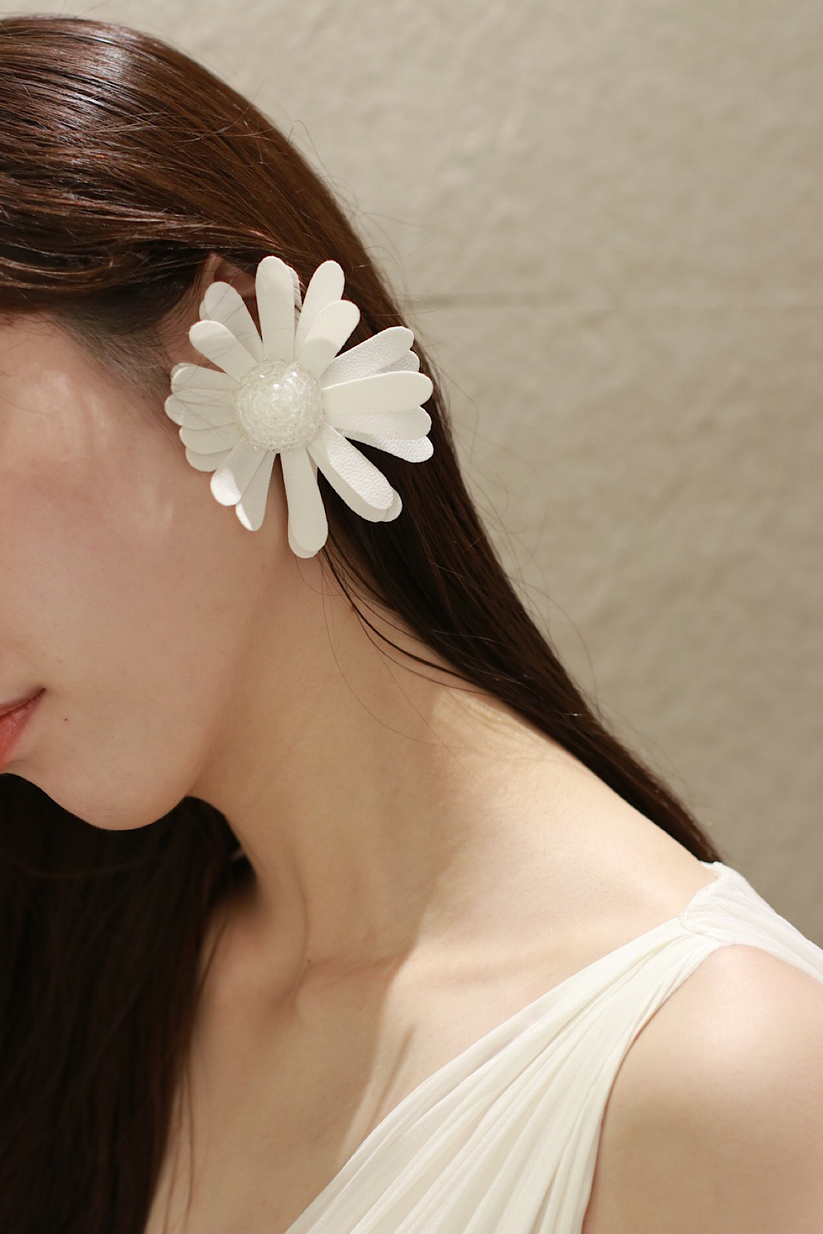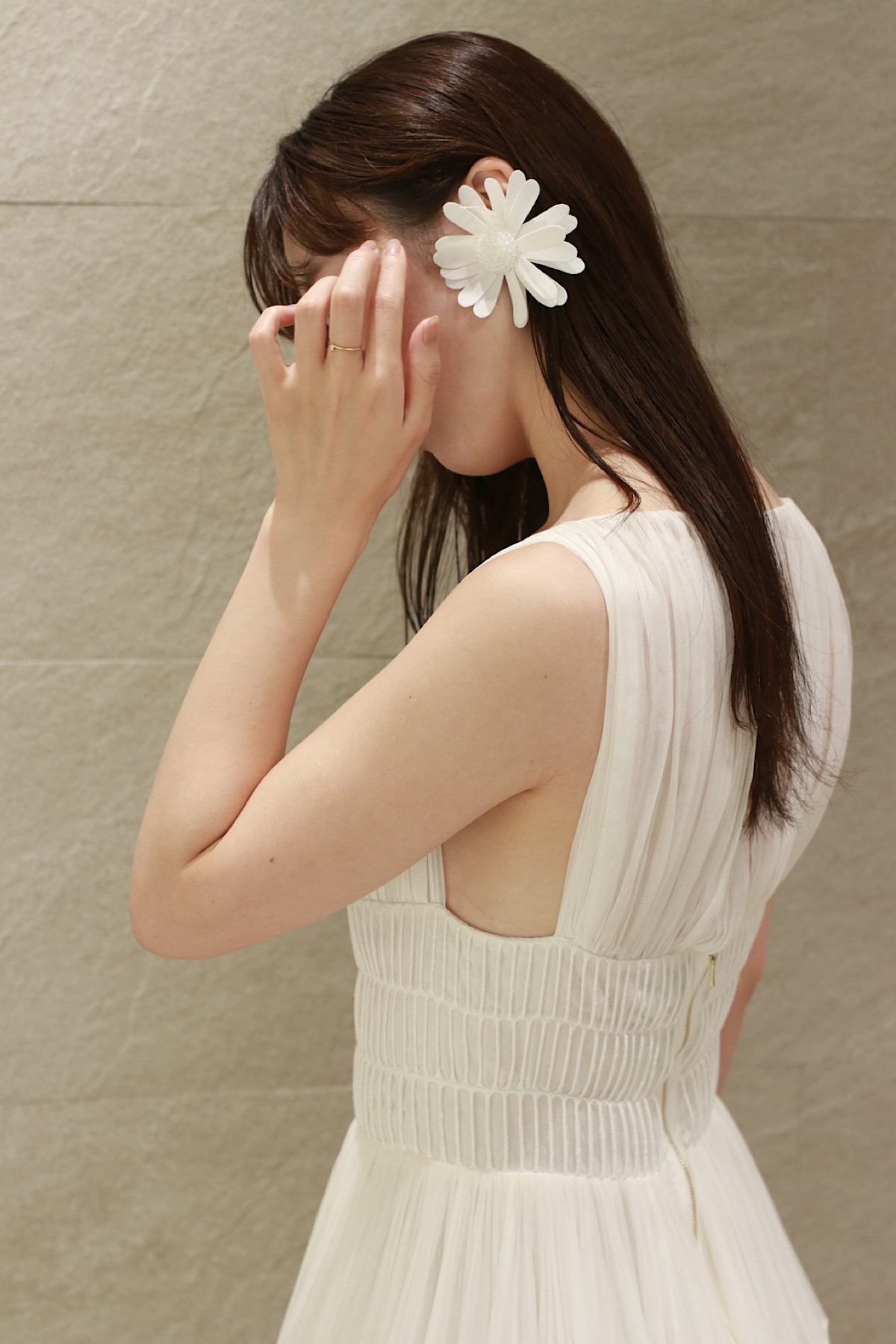 繊細なプリーツと余韻を残して揺れ動く上質なファブリックがファッショナブルなウェディングドレスにはVIKTOR&ROLF MARIAGE(ビクター アンド ロルフ マリアージュ)のアイキャッチーなフラワーモチーフのイヤリングを。フラワーモチーフの中心には自然光で輝くクリアビジュー、花びらにはマットな素材を掛け合わせ作られた、世界中どこを探しても見つけることのできないビクターアンドロルフらしい遊び心のあるデザイン。そんなアイキャッチーなイヤリングはファッショナブルなスタイルを心から楽しむことが好きな花嫁におすすめしたいコーディネートです。ヘアスタイルはあえてエアリーなダウンスタイルにすることで、ファッショナブルな中にも抜け感が生まれ、心ときめくコーディネートを自然体に楽しむ、そんな花嫁が誕生することでしょう。ホワイトを基調とするコーディネートにより、ウェディングドレスとアクセサリーそれぞれの異なる上質な素材が引き立ち合い、どの瞬間も魅力あふれるブライズスタイルが完成します。