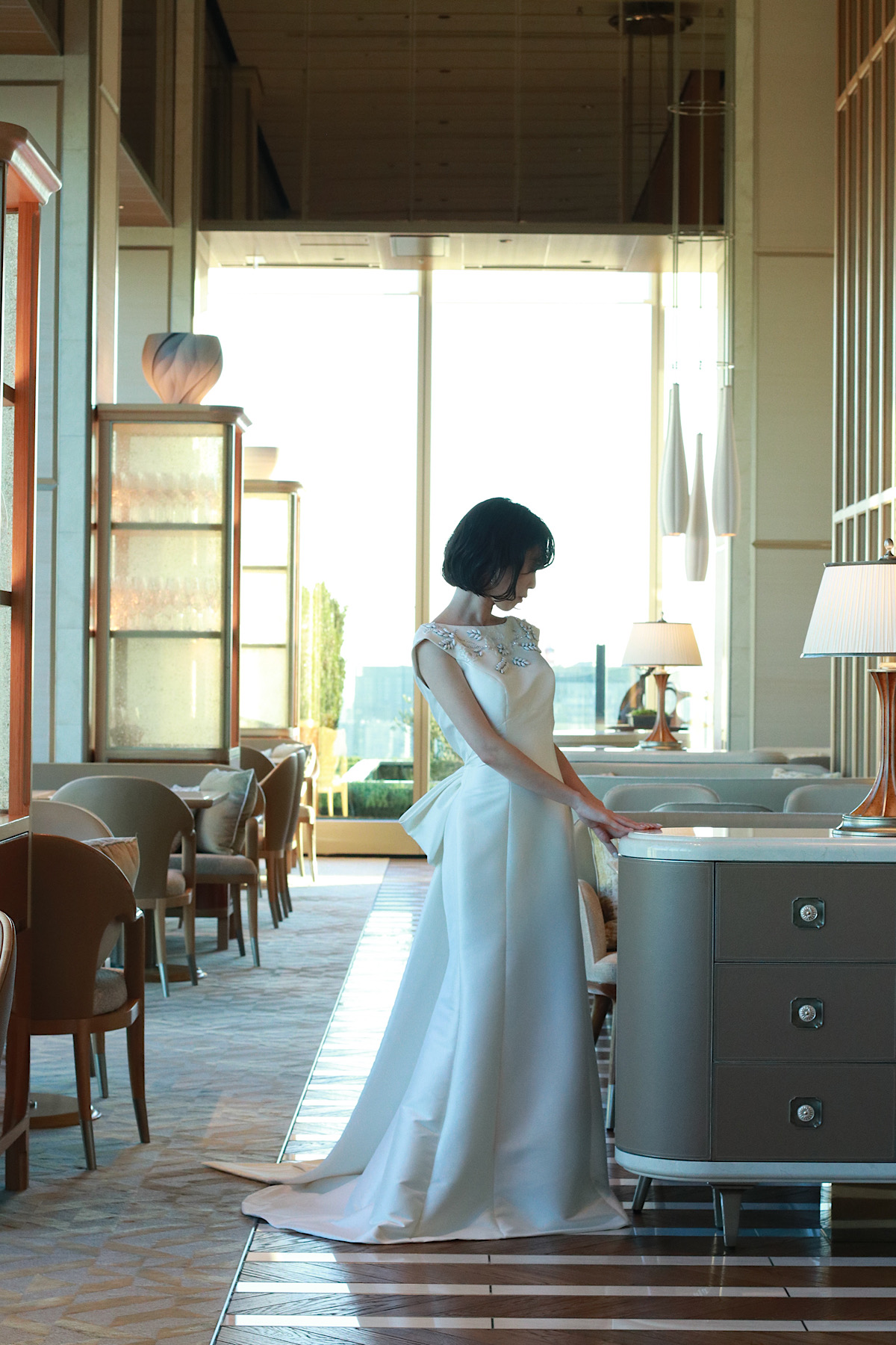 本日ご紹介するウェディングドレスは、艶やかで上品なハリ感としなやかな女性らしい曲線美がエレガントな印象を叶える一着。花嫁のボディーラインより内側に切り替えがある計算し尽されたパターンは花嫁のシルエットをよりスタイリッシュに美しく魅せてくれるのです。そして2024年の最新コレクションでも多く見られたハイボートネックとフレンチスリーブがクラシカルな印象を与えます。立体的なビーズやストーンでデザインされた胸元のフラワーやリーフモチーフはクラシカルさの中にモダンな印象を与え、ヴィクター アンド ロルフ マリアージュらしい上品で想像を超えるエレガントな雰囲気を叶えるのです。シックかつラグジュアリーなフォーシーズンズホテル東京大手町のチャペルでは、永遠の愛を誓う花嫁の幸せそうな表情に華を添え、アットホームなパーティーシーンでは花嫁の動きに合わせてきらめきを放ち、心躍る気持ちをより一層高めてくれる可憐なモチーフです。また、バックスタイルはフロントのデザインとは大きく魅せ方を変え、大胆に開いたVのカッティングが花嫁の線の美しさをより一層際立たせます。腰元にあしらわれたモードなリボンモチーフは、ただクラシカルなウェディングドレスではなく、遊び心のあるモダンな印象を叶えるのです。