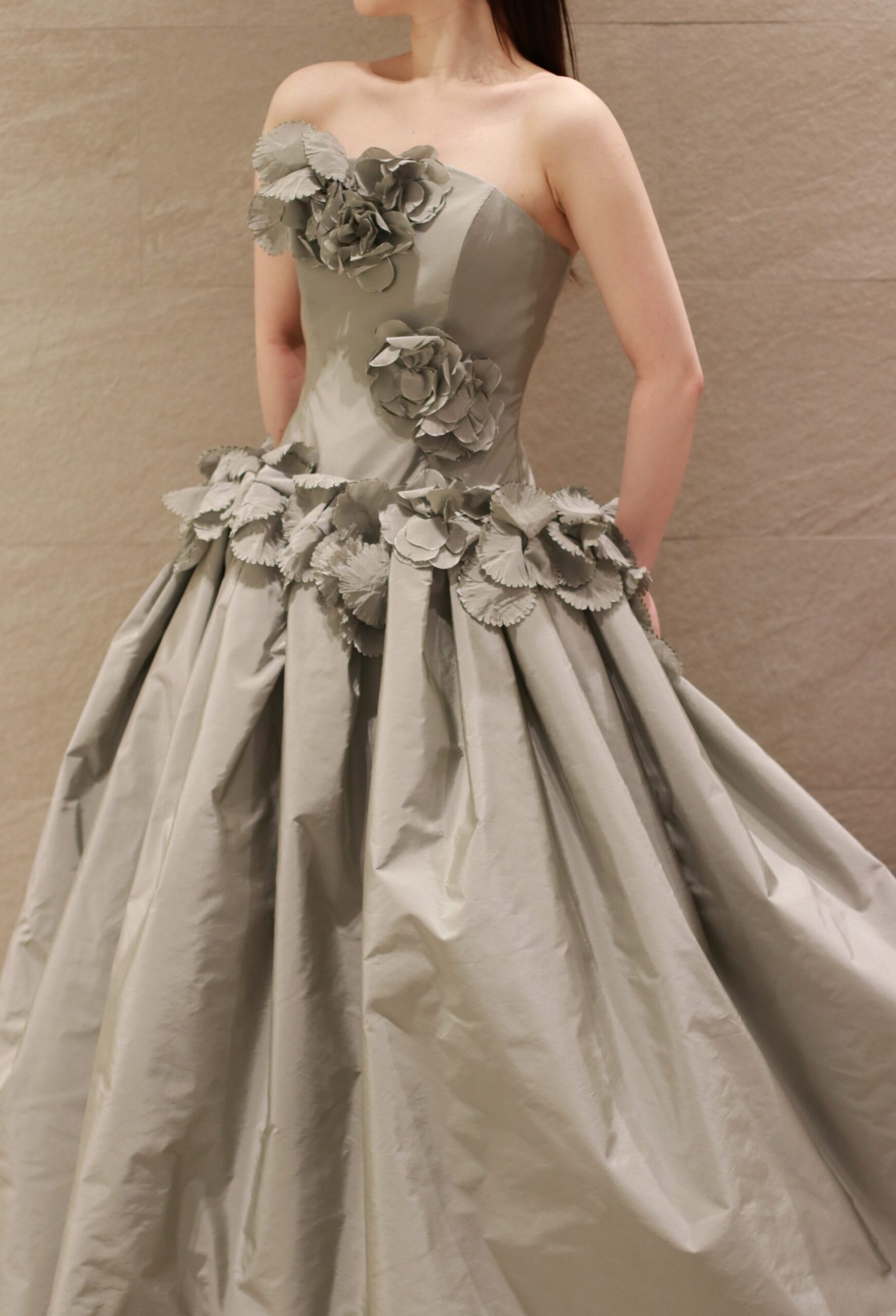 ゲストの皆様の想像を超えるようなデザインを上品なグレーのカラーで表現したヨーランクリスのカラードレスでエレガントに、そしてファッショナブルに纏ってみてはいかがでしょうか。