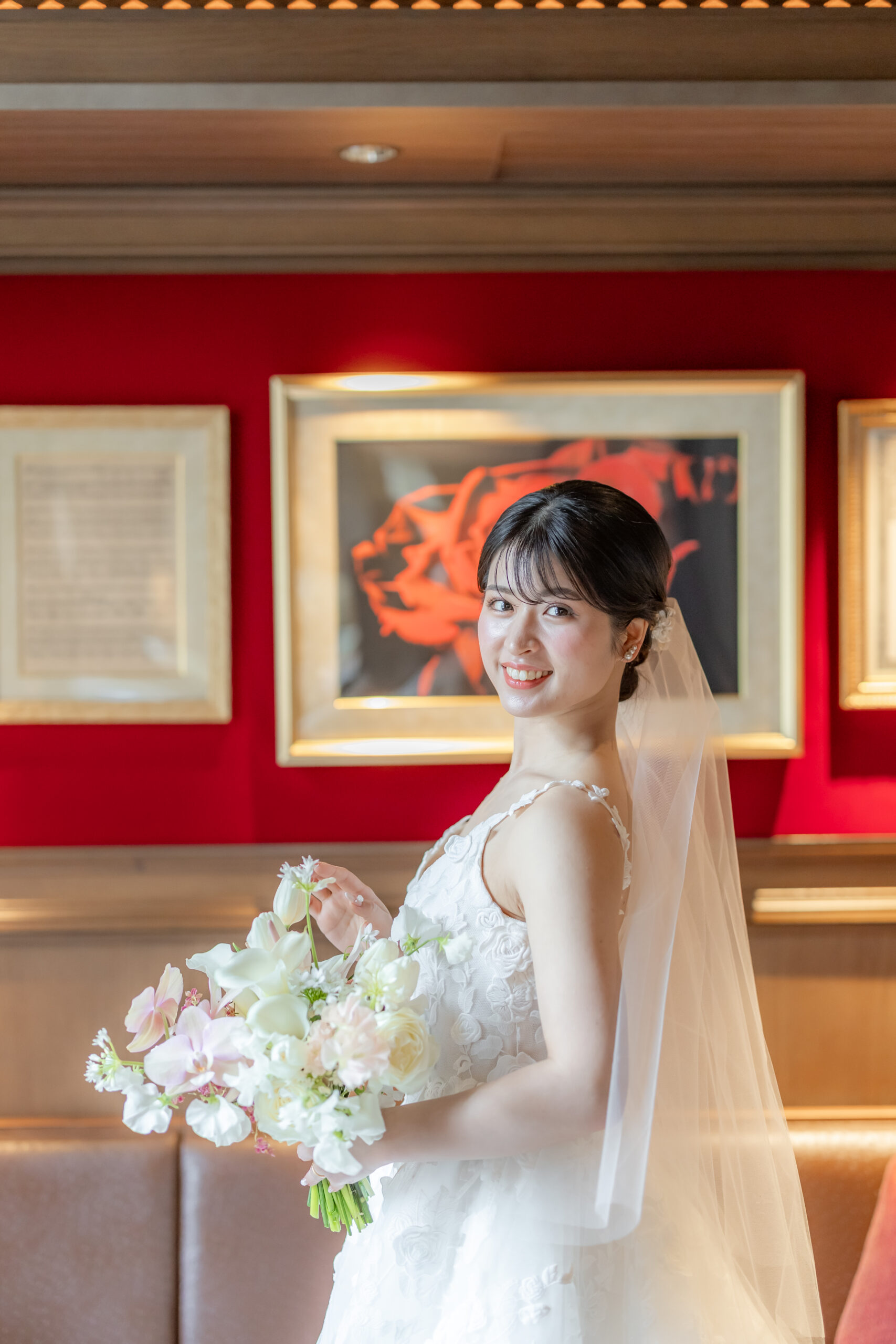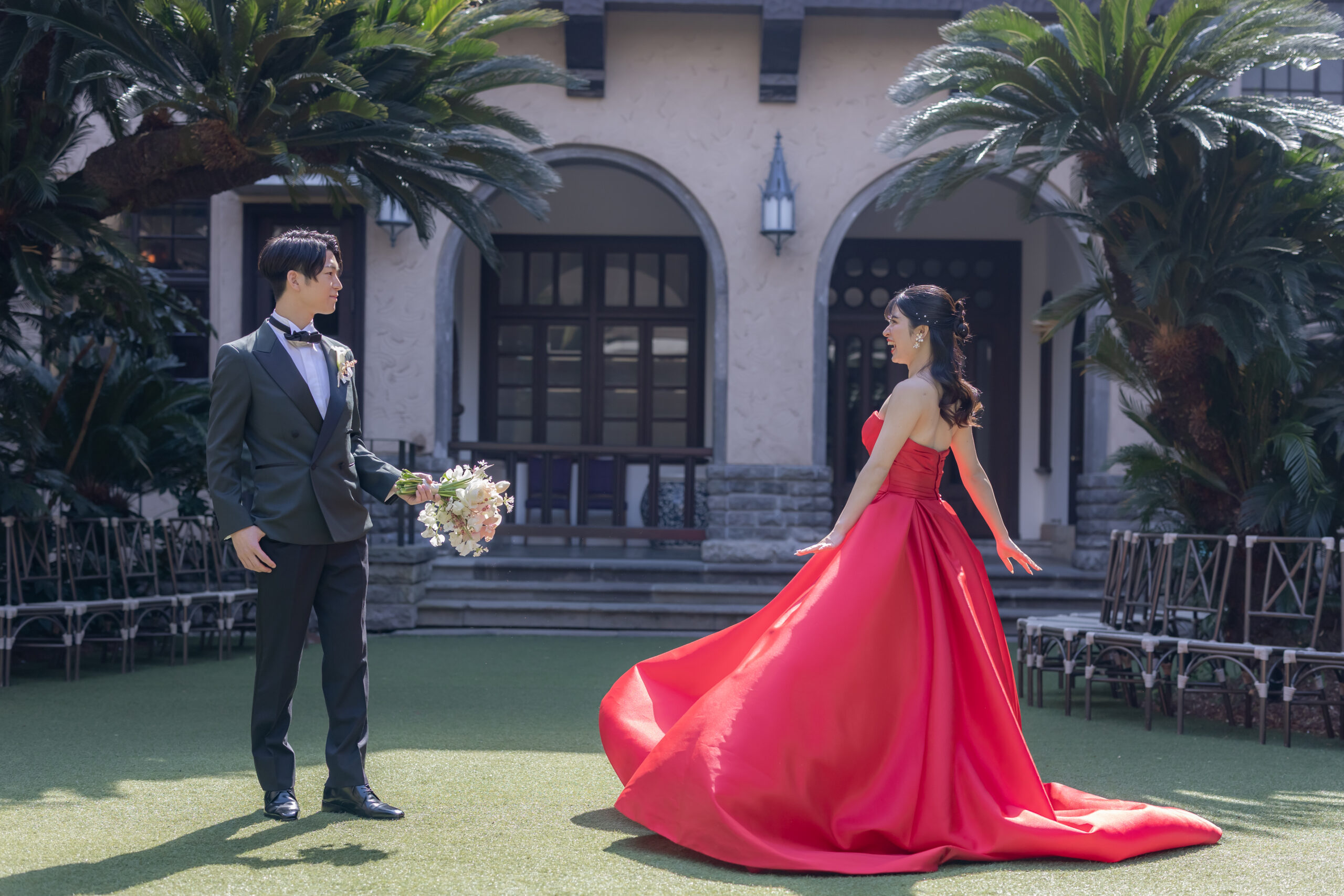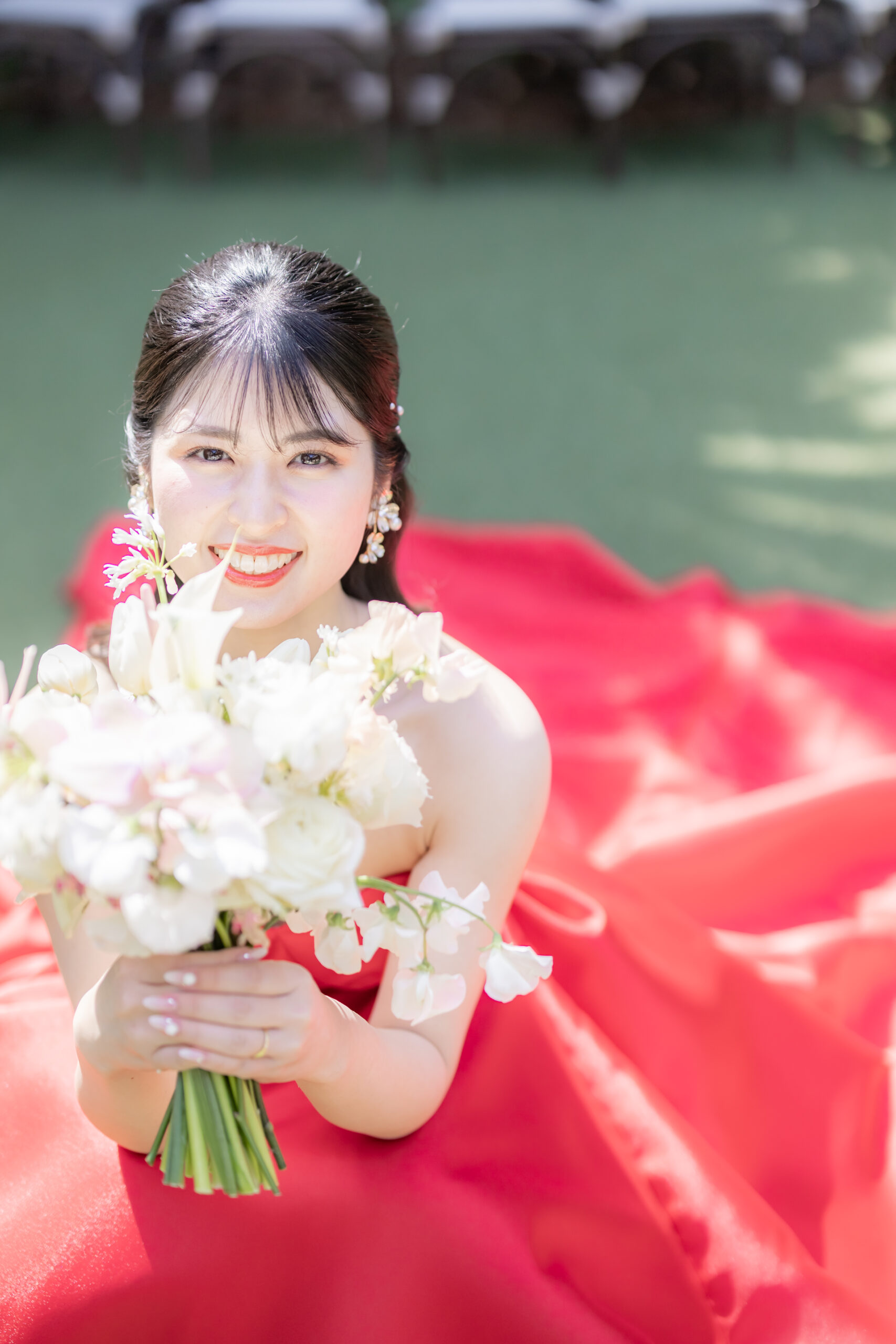 華麗なレッドのカラードレスが、目鼻立ちの美しいご新婦様をより一層上品で、可憐な印象に。