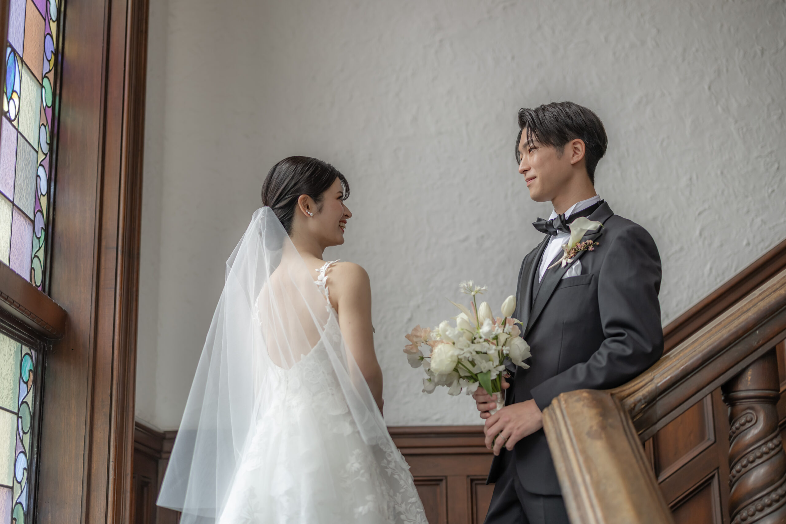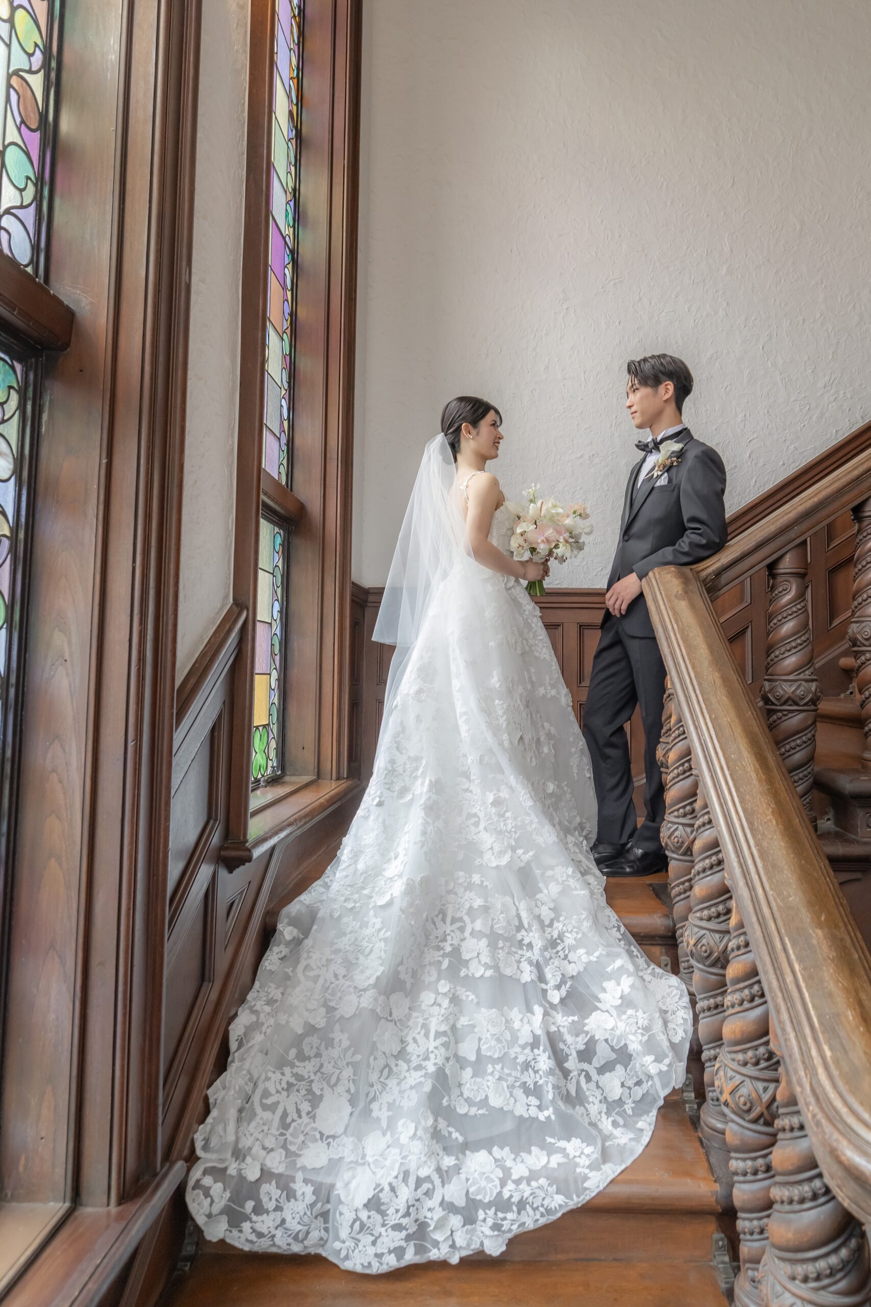重厚感溢れる洋館に佇むご新婦様のお姿は、クラシックでありながらどこか都会的。今の時代だからこそ叶えることのできる、New classic styleが完成しました。