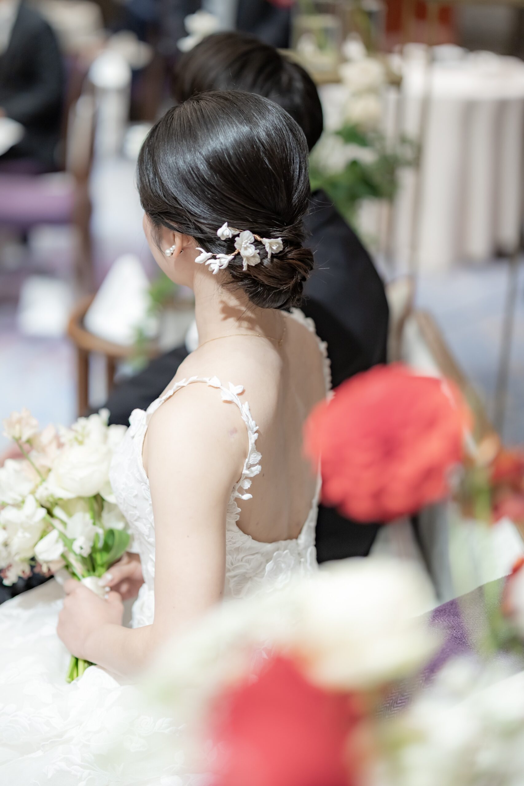 披露宴からは、可憐なホワイトのフラワーモチーフのヘッドパーツを添えて。