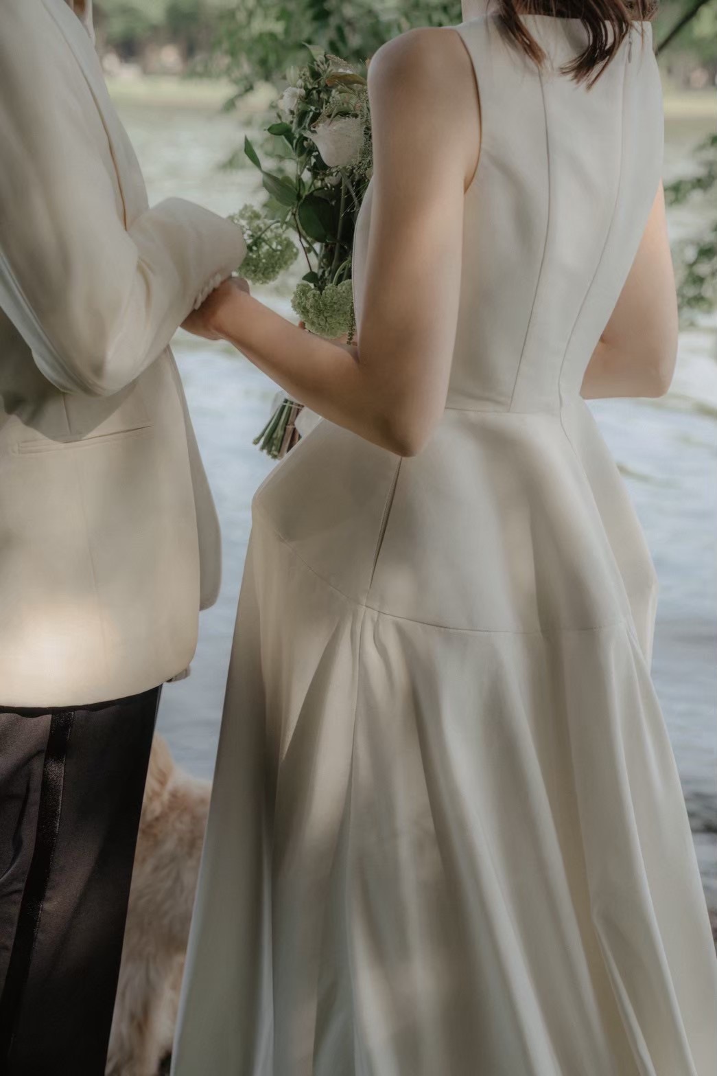 ウエストの立体的な立ち上がりや後ろの首元のストレートカット、それに対して華奢な肩のデザイン。