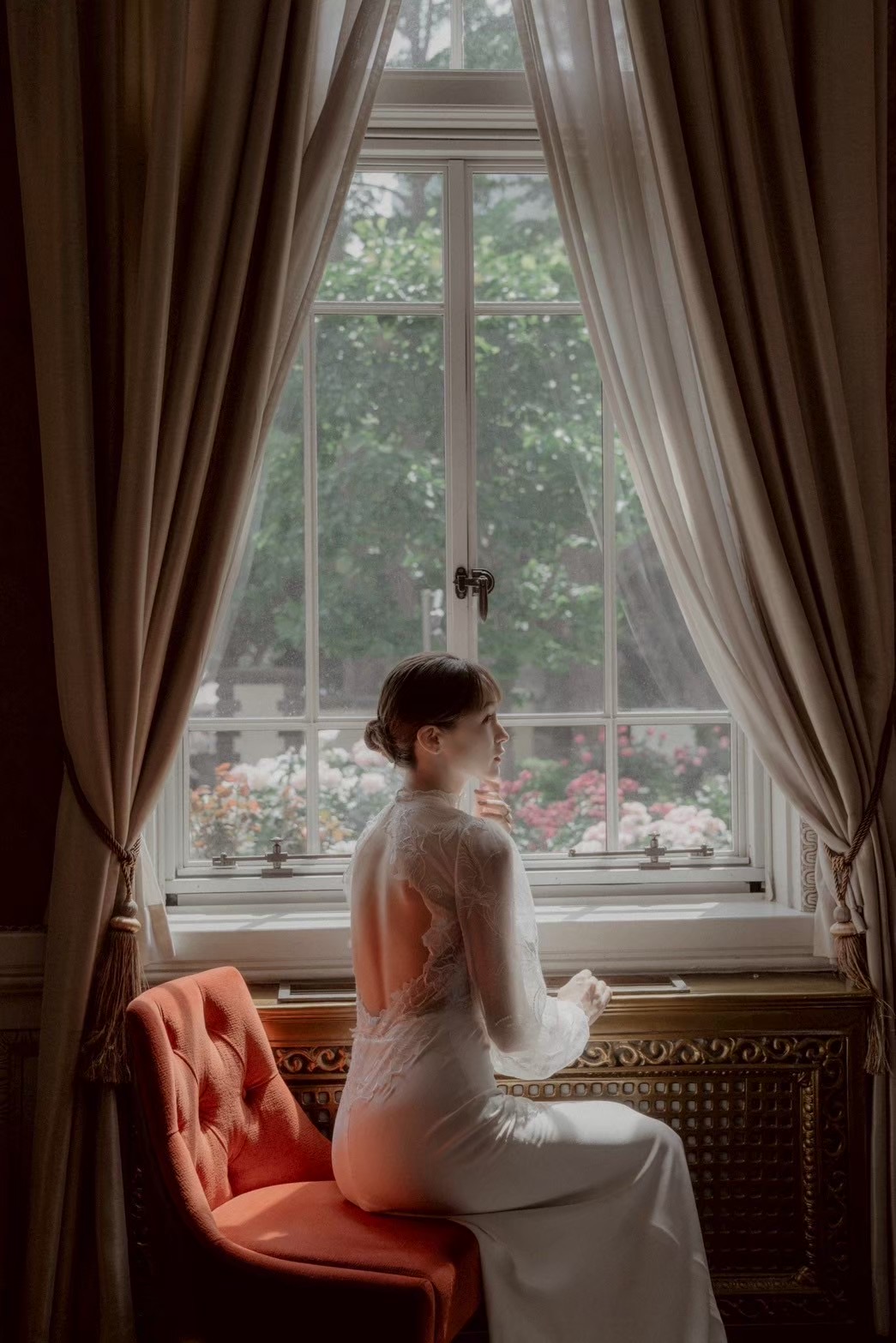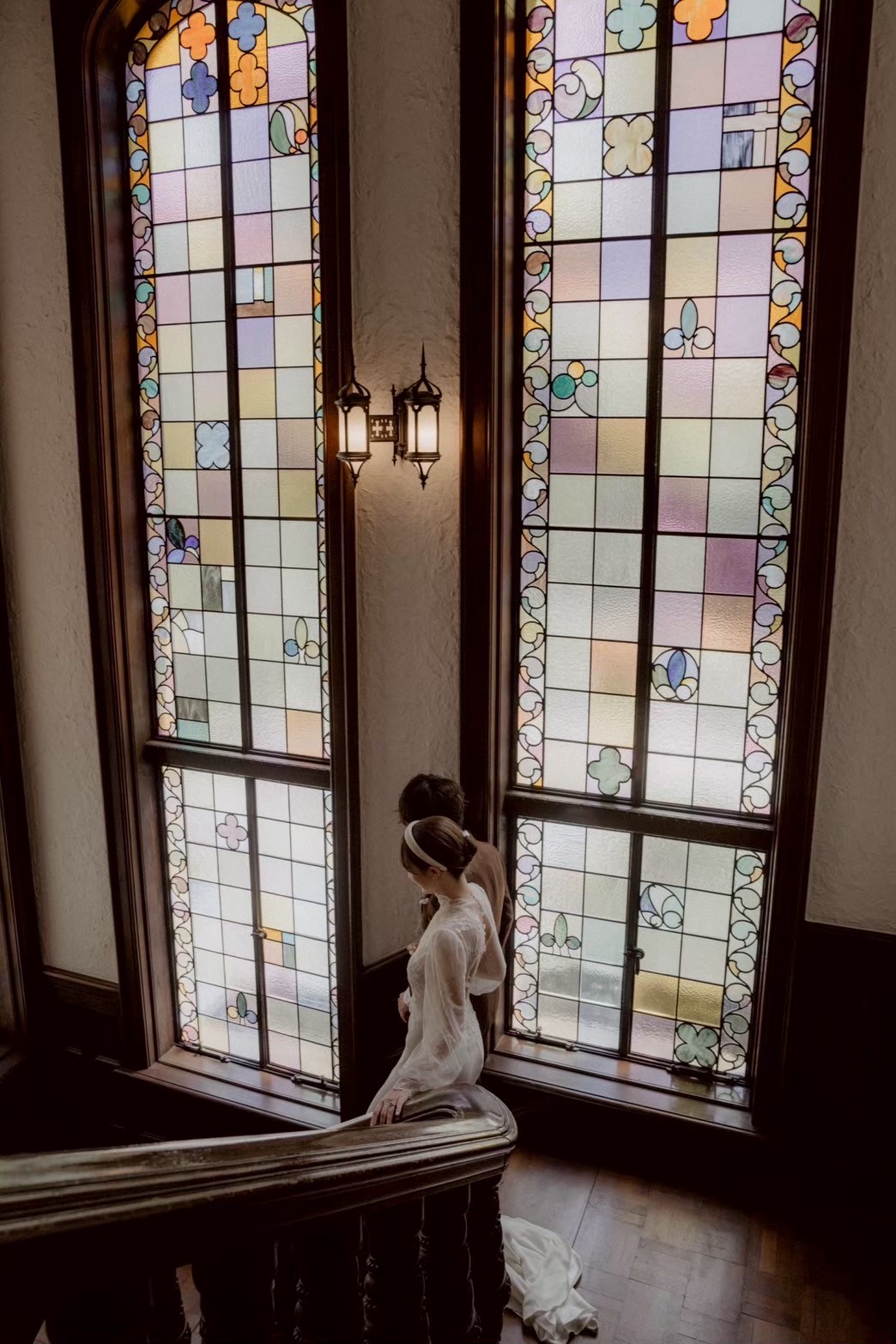柔らかい光が差し込むステンドグラスや、バラ園、館内のインテリアなどは色鮮やかでありながらもドレスのしなやかさやサチさんの透明感によって優しく優美な雰囲気を醸し出します。