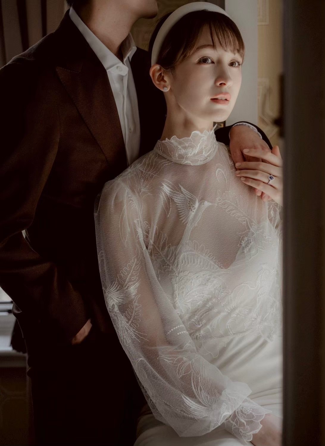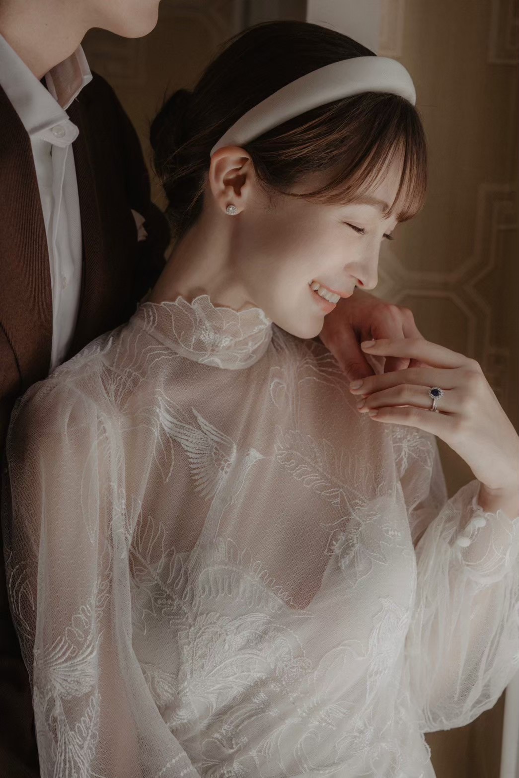 こちらのドレスはカフスが手の甲を覆うデザインになっているため、きっと婚約指輪も素敵にお写真を残していただけると思ったのもおすすめした理由の一つです。