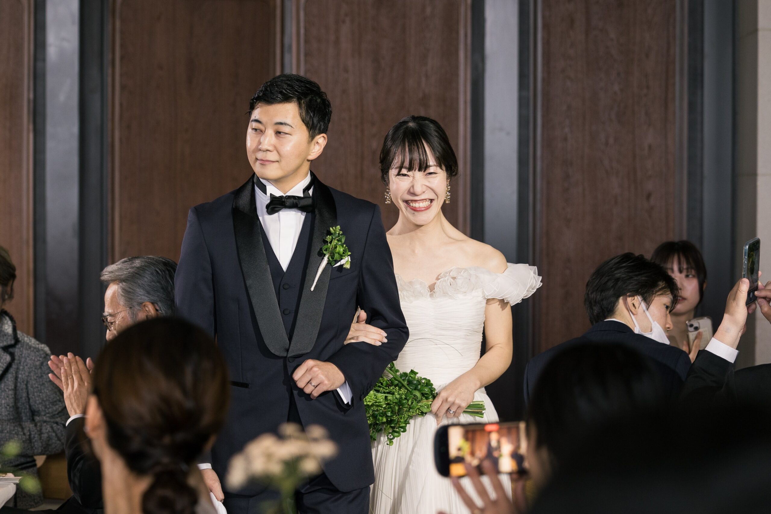 アンダーズ東京での結婚式で、トリートドレッシングのラグジュアリーなウェディングドレスとタキシードをお召しになりながらお色直しで入場するお二人。