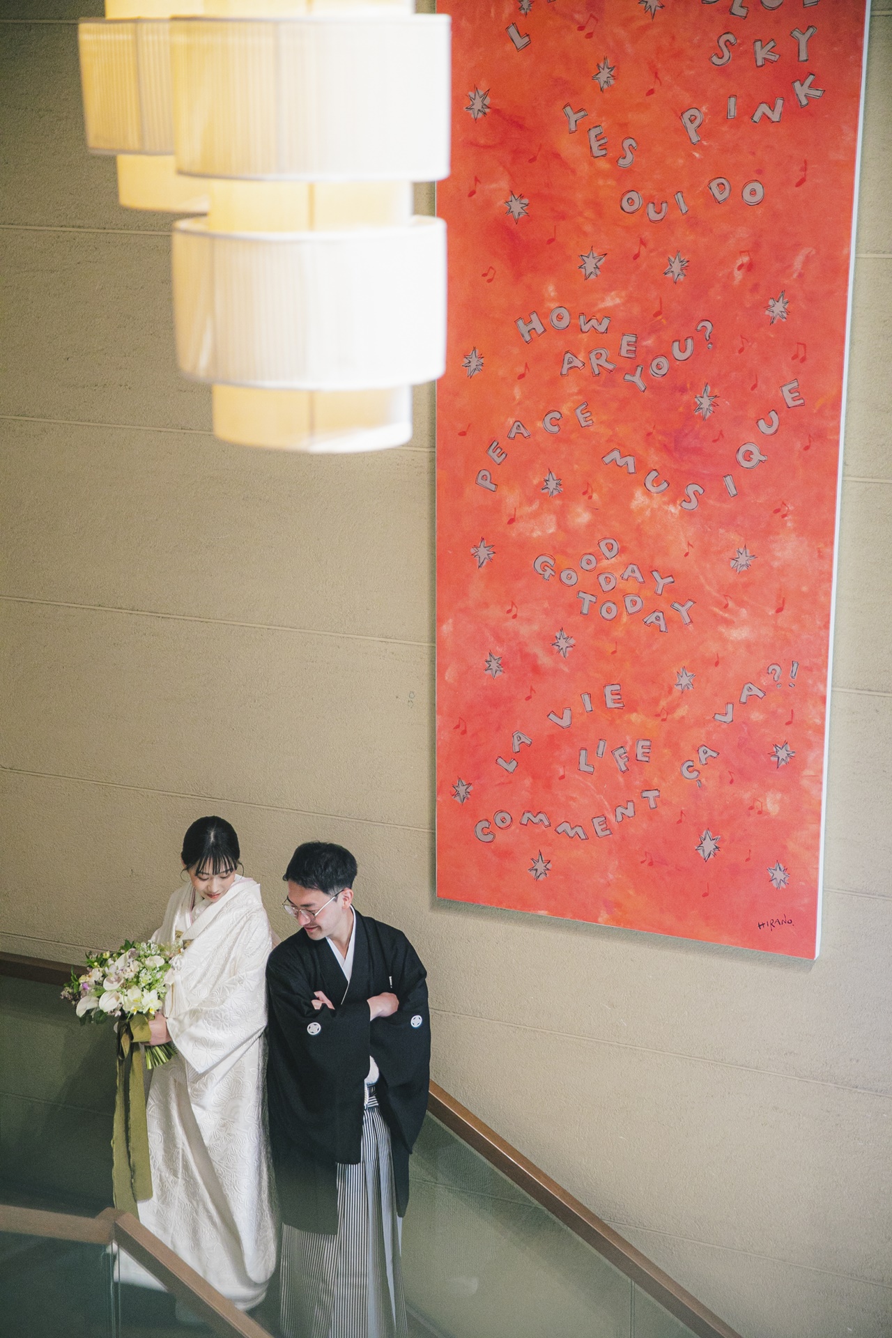 青々と生い茂る豊かな緑が広がる屋外、ポップで遊び心のあるアーティスティックな館内。シーンが変わるごとに、まったく異なる表情のお写真をお撮りいただくことのできるウィズ ザ スタイル フクオカでの前撮りは、この場所でご結婚式を挙げられるおふたりだけしか味わうことができない特別なものです。挙式当日にお支度を終え、チャペルへ向かうプールサイドの道のり。春に吹く優しい風を感じるような爽やかなショットが、数年後見返した時にもその日の情景を思い出させることでしょう。ウィズ ザ スタイル フクオカならではのポップなビビッドイエローをバッグにした、おふたりの明るいオーラを表現したような一枚。シャッターを押した瞬間の楽しい空気感が伝わるお写真に心動かされます。おふたりらしさの詰まったバリエーション豊かな写真は、ゆったりと撮影を楽しんでいただける前撮りだからこそ。魅力を引き出すカメラマンやヘアメイクは結婚式まで担当をさせていただくため、結婚式当日も安心してお任せいただけます。モダンでポップ、日常を忘れさせる刺激的な空間の中で、一見相反するような和装という日本の伝統衣裳を纏い、おふたりらしさが詰まった特別なお写真を残してみませんか。