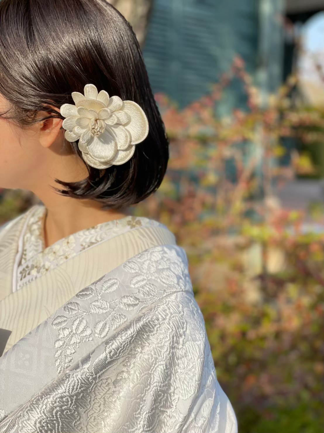 お衣装選びの際に思いを持って選ばれた「本物」の白無垢には、合わせるお小物もこだわりを持ってお選びいただきたいです。今回白無垢のご紹介とともに一緒に着用しているこちらの髪飾り。この度、トリートドレッシングにて新たにお取り扱いをスタートいたしました。一つ一つハンドメイドで製作された”花刺繍”の髪飾り、emi takazawa(エミ タカザワ)。群馬県桐生市の伝統的な刺繍技術「横振り刺繍法」で国産の上質な絹糸を贅沢に使用し、一枚一枚刺繍された花びらに熱を加えて丸みを作り、丁寧に花びらを数ミリ単位で微調整しながらそれらを合わせて製作されています。全てハンドメイドで製作された花刺繍の肌触りはしっとり柔らかく繊細で、絹糸の艶やかさと滑らかさと優美さを感じるシルエットは息をのむほどの美しさです。白無垢と合わせることで、お顔周りや首筋に華を添えるでしょう。これらの髪飾りは実在する花々ではなく、全て作家高澤恵美さんの想いが込められた架空の花で、一つ一つ心温かくなるストーリーが存在します。