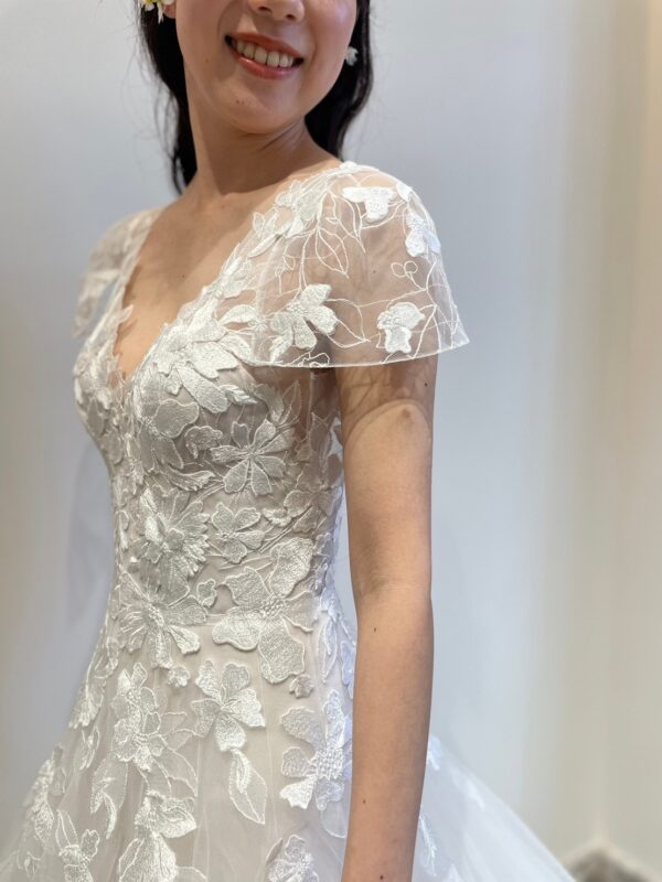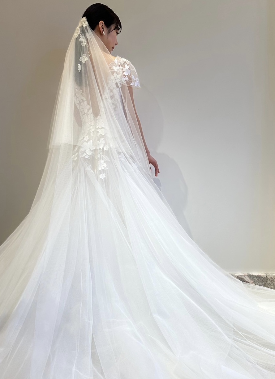 この度、神戸店に入荷した新作ウェディングドレスは一目で手刺繍の美しさとチュールの透明感が目を惹くドレスで、上質思考の神戸花嫁におすすめしたい1着です。柔らかなシルクチュールに施された手刺繍の上にハンドメイドで作られたフローラル柄のカットレースをあしらうことでミラ ズウィリンガーならではのフェミニンなテイストを表現してくれます。刺繍糸には最上級のシルク糸を使用し自然光に当たると肌の透明感をより一層引き立たせ女性らしい軽やかさと可憐さを昇華させてくれることでしょう。大胆に開いたVカットの胸元とバックスタイルのディティールがあることで甘くなりすぎずどこかセクシーで大人フェミニンな印象に。花嫁の二の腕にそっと寄り添うスリーブは柔らかで透け感のあるチュールで腕周りを優しく包み込み、華奢さを演出してくれます。ふわりとゆとり感があり、腕周りに刺繍を描いたような特別感があるデザインに仕上がりました。ウエストラインを美しく映し出すAラインのスカートには上半身のデザインとは相反して刺繍やレースは施さず、触れるのも躊躇うほどたっぷりのシルクチュールを使用し抜け感と高級感を堪能することができます。神戸の上質さ溢れる会場やグリーンや木の温もりをコンセプトとした会場におすすめしたい1着です。