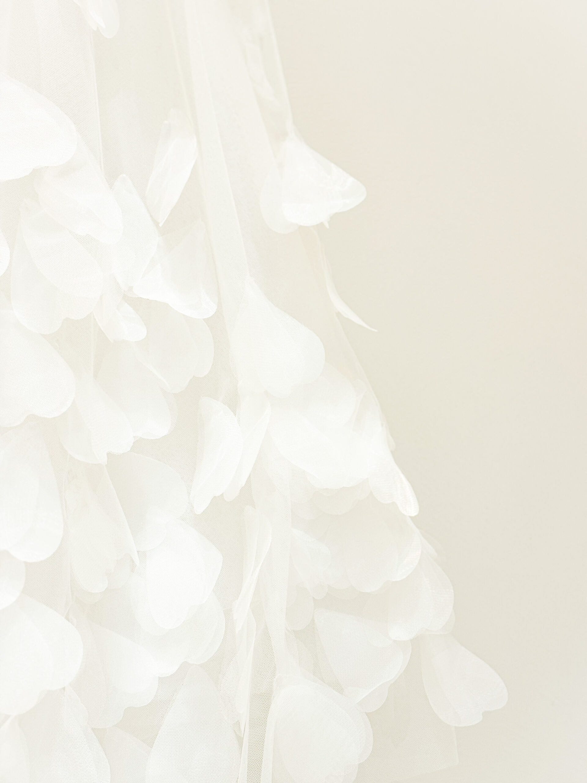 「Clover」と名づけられた、ハートのモチーフが愛らしい2wayのウェディングドレス。柔らかくロマンティックなシルクチュールが広がる2wayの新作ウェディングドレスに、リズ・マルチネスは「私たちのガウンの中でもCloverは究極のロマンティックなウェディングドレスなの」と語っています。ウエストから裾元にかけて広がる長いトレーンにはキャッチーなハートのモチーフが手作業でふんだんにあしらわれ、愛らしさを表現します。シルクチュールがたっぷりと使用されたAラインの生地は触れることも躊躇するくらい繊細で、澄んだ空気を纏うかのような透明感とエアリーさは、お二人やゲストを幸福感たっぷりなオーラで包み込んでくれます。細かく取られたギャザーが美しい胸元から肩をそっとショールで包みこむと一段に透明感が感じられ、お顔まわりを明るく見せてくれます。ヘアスタイルは作りこみすぎないシニヨンでまとめることで、よりエレガントな印象を演出。またショールはオフショルダーでお召しいただくことで、胸元のハートシェイプとデコルテが引き立つスタイルに。ふんわりとなびくリラックス感のあるダウンヘアが、ロマンティックでありながらも可憐な雰囲気を放ってくれます。このようにスタイルをチェンジし2wayでお召しいただくことで一着のウェディングドレスでも表情の変化をつけることができ、お二人らしい自由なスタイリングを楽しんでいただくことができるのです。
