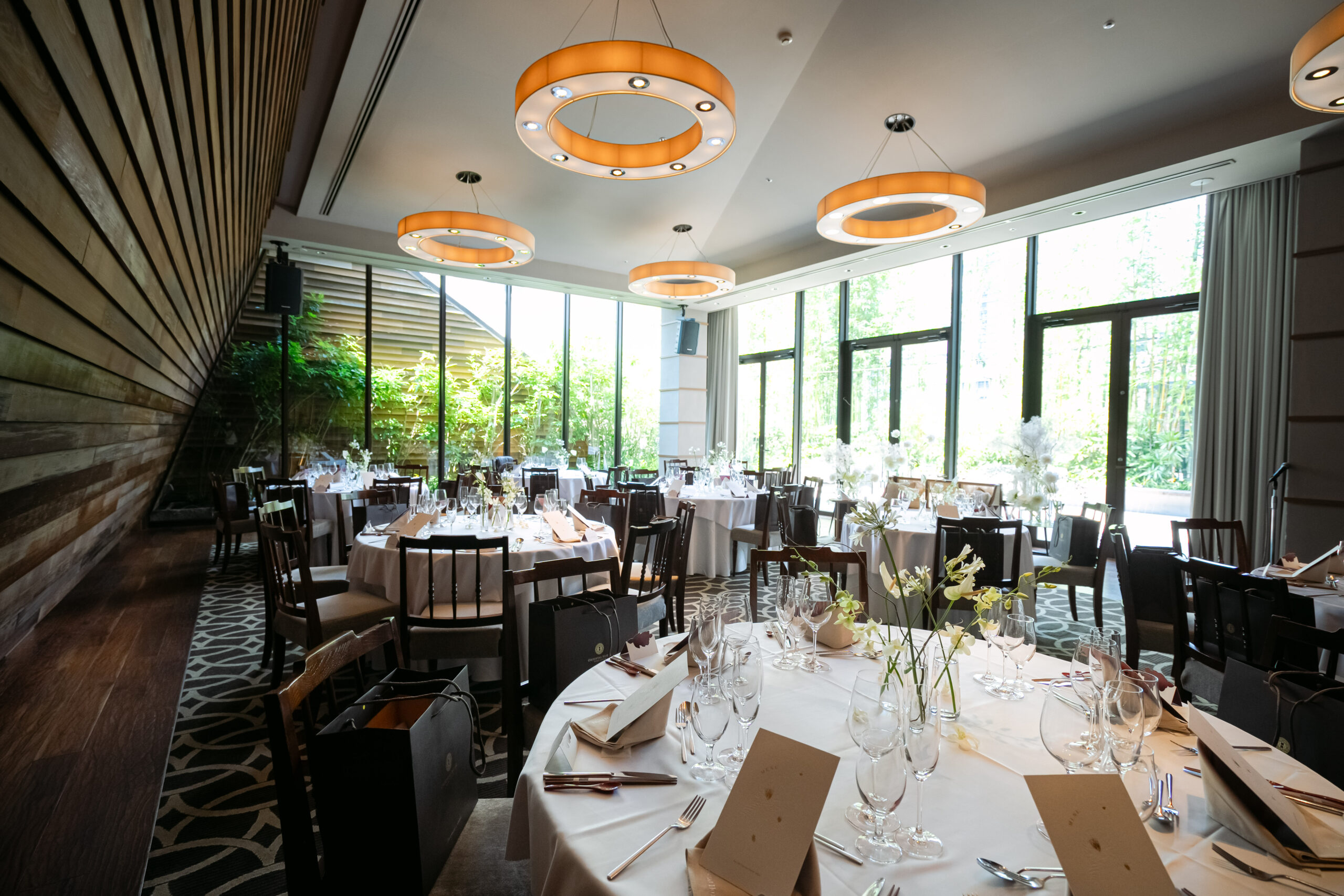 披露宴会場は大きな窓から優しい光が差し込み、木のぬくもりを感じるインテリア。