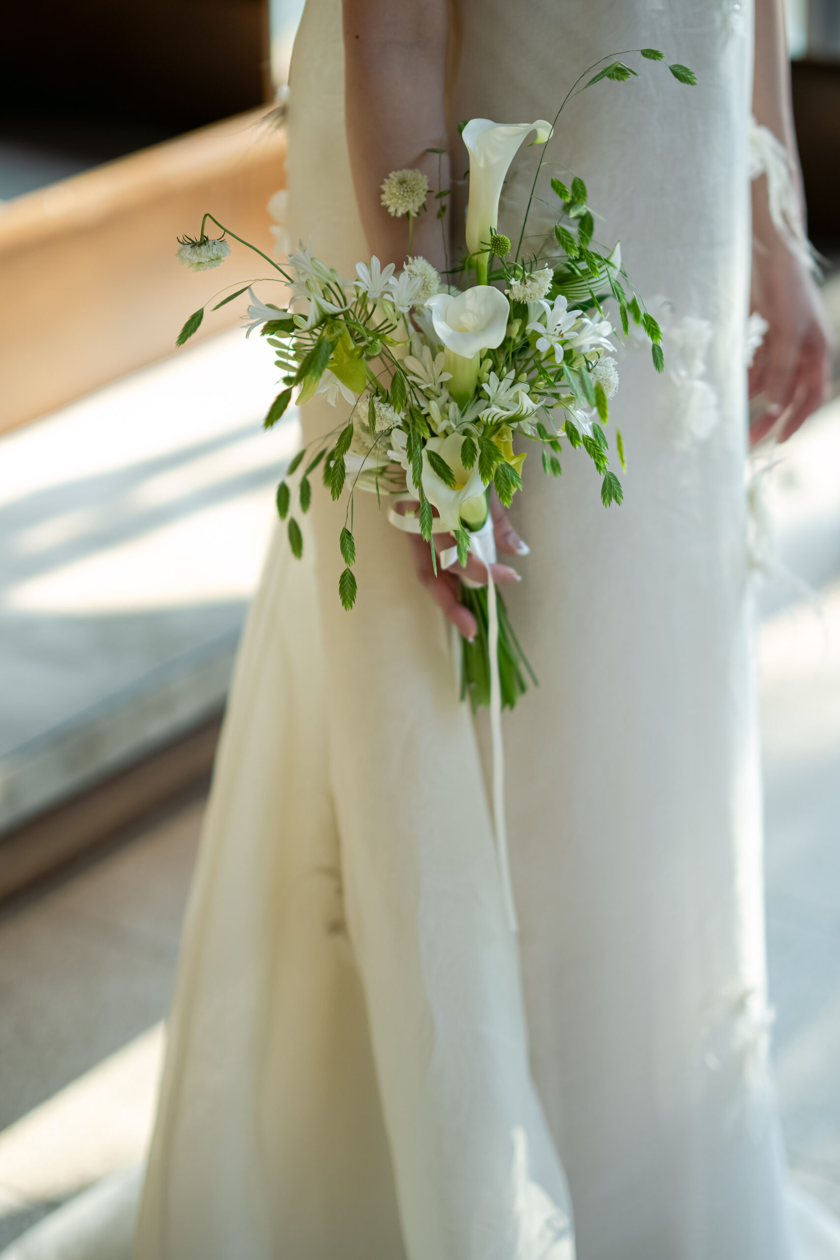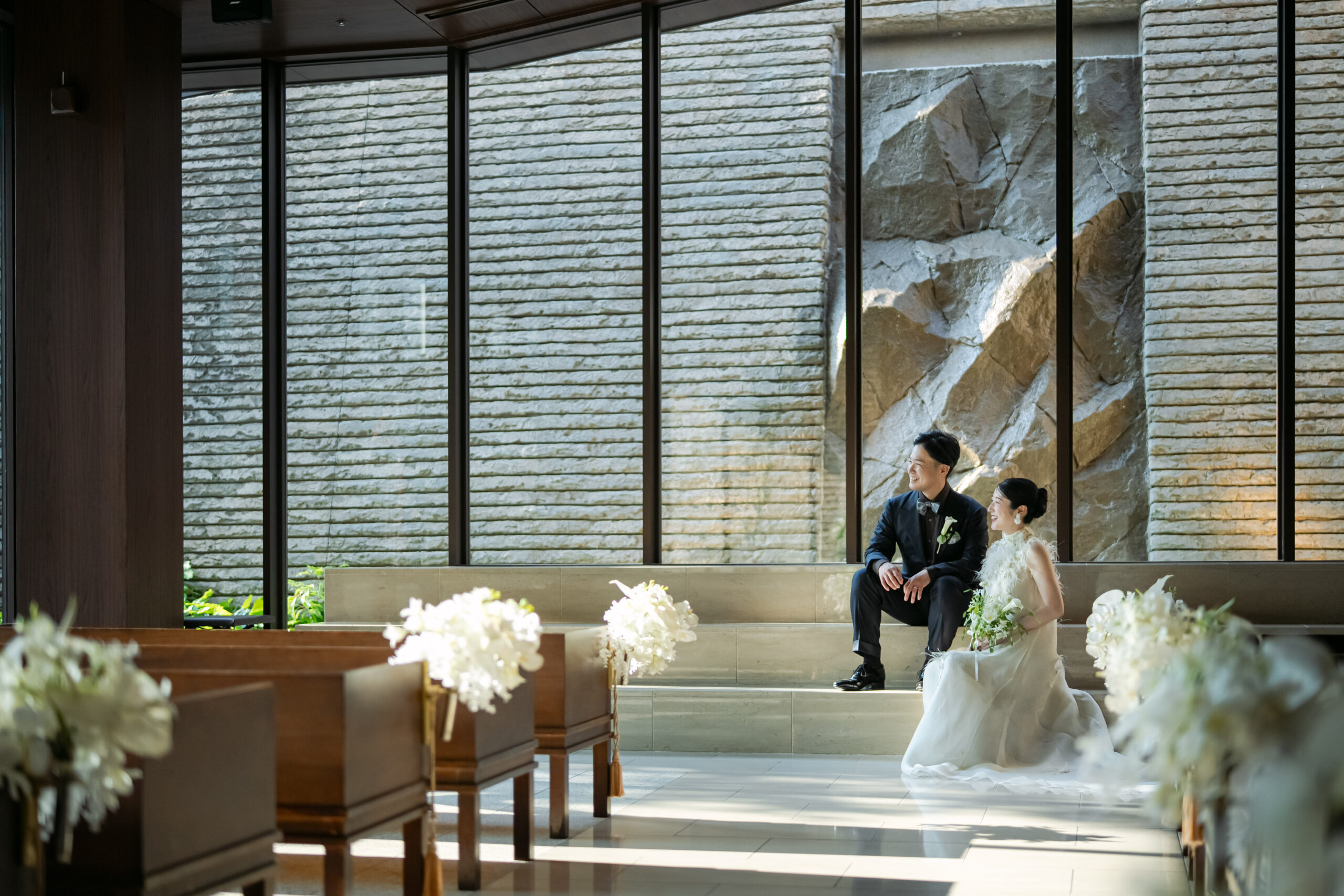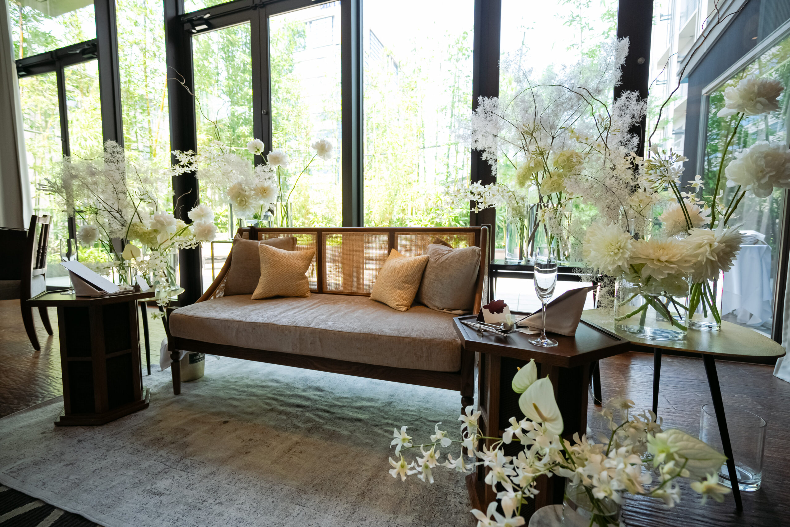 柔らかな自然光の中でもしっかりと存在感を放ち、モダンで洗練された会場の空気に溶け込みながら、新婦様の凛とした美しさをそっと引き立てる佇まいが印象的でした。