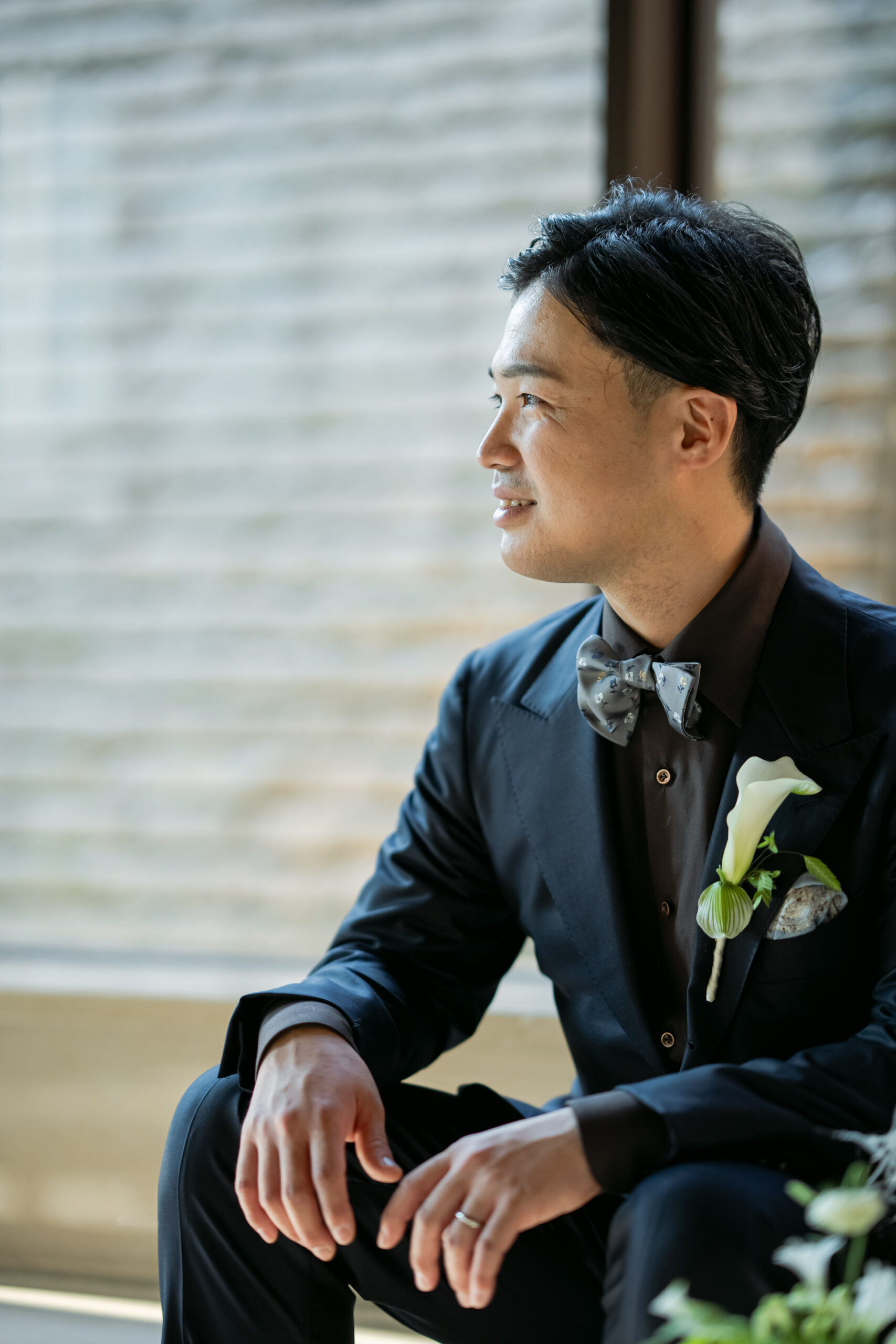 新郎様のお色直し衣裳はTHE G’S HIDEOUT.(ザ ジーズ ハイドアウト)のオーダースーツ。
