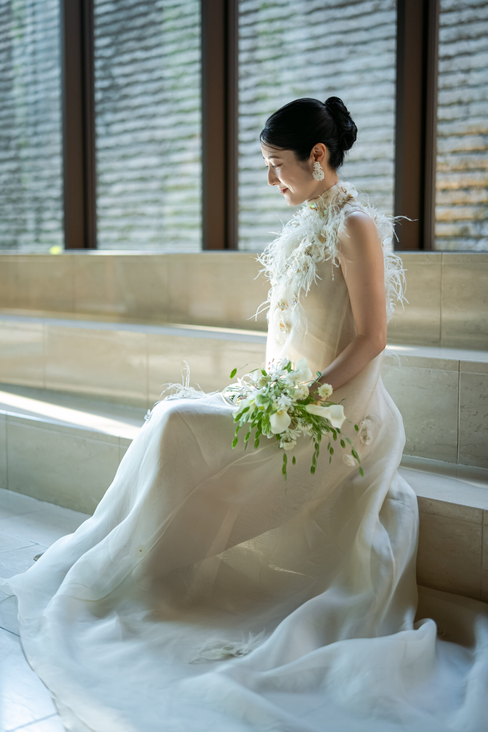 オーストリッチフェザーやスパンコールの繊細なディテールと、シルクオーガンジーの軽やかなシルエットが、ナチュラルな美しさを演出。