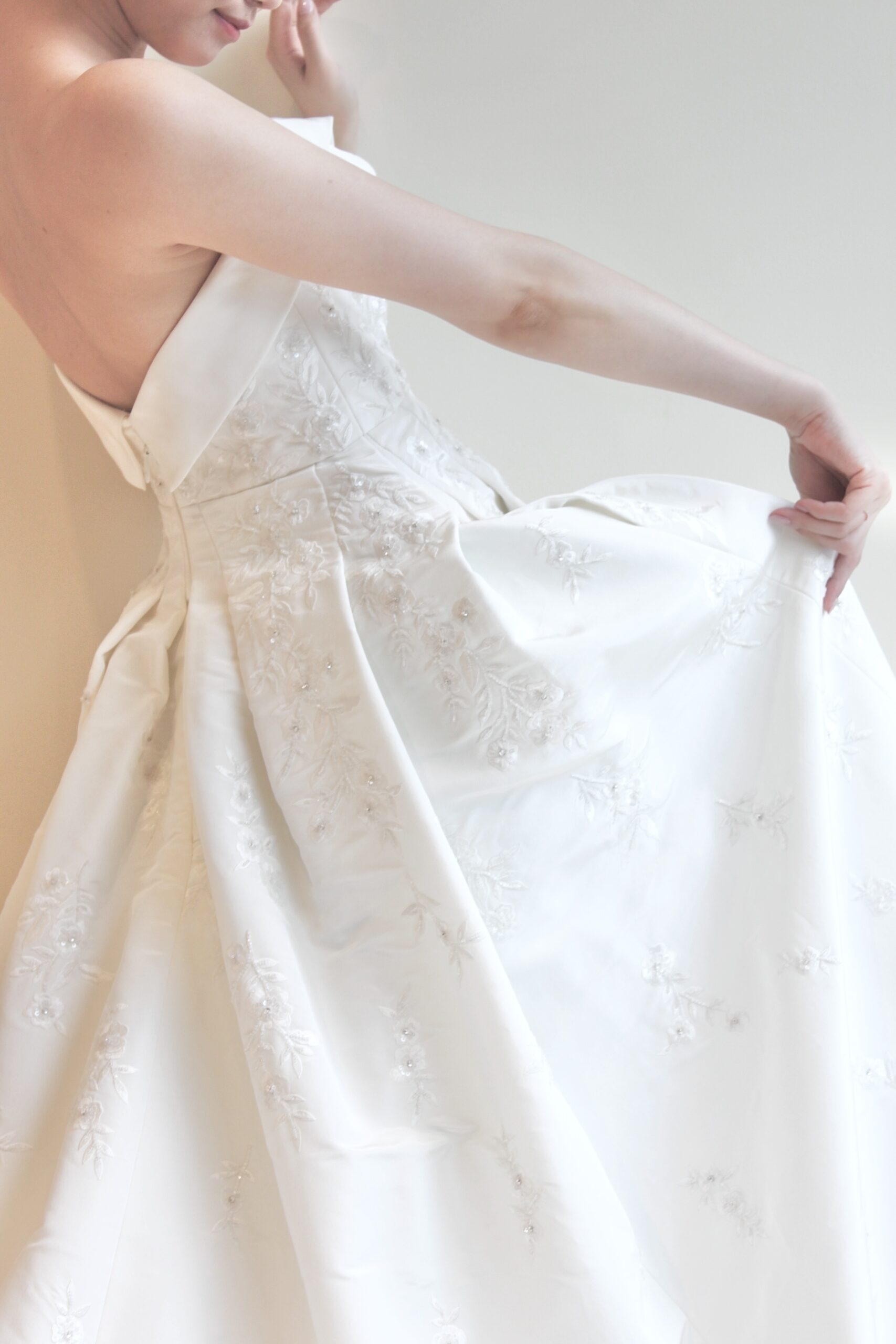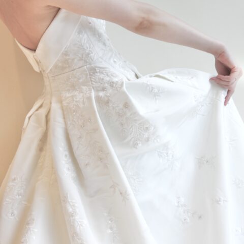また、流れるように施された刺繍は自然な動きを生み出し、シルエットとデザインのバランスが絶妙にとられています。計算して配置されたボタニカル模様の刺繍も大きすぎず、小さすぎず、上品さと可憐さを全面に演出します。レースの装飾とはまた違い、刺繍には刺繍にしか作り出せない立体感があり、どこか和装を彷彿させるその姿はまさに京都エリアのクラシカルでモダンな結婚式場にぴったりです。