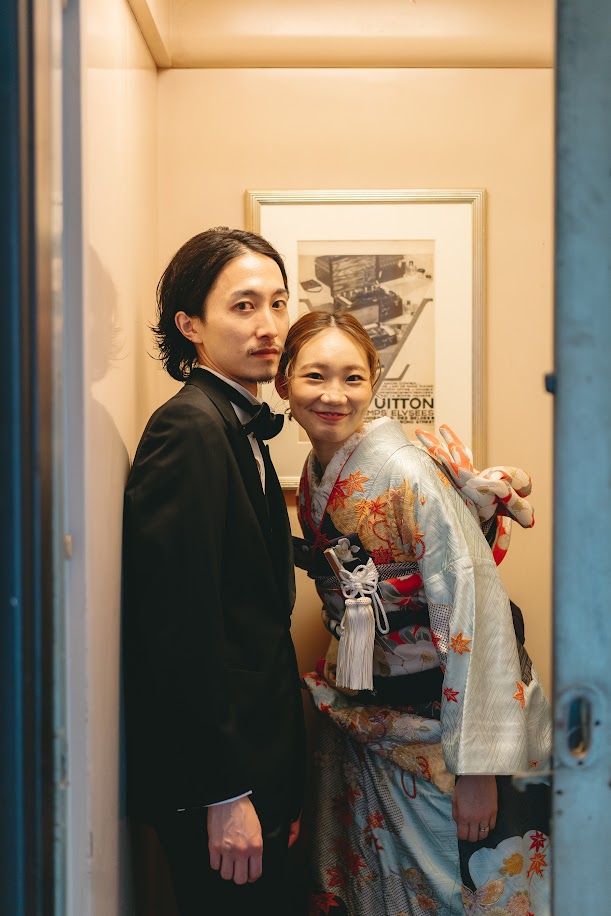 近代建築の巨匠と呼ばれていた武田五一の設計により、1927年に誕生した島津製作所旧本社ビルをリノベーションし出来上がったフォーチュンガーデン京都。アーチ型の正面玄関や蛇腹式のエレベーター、今では希少な大正ガラスが使用された丸い窓など、当時の最先端を象徴するデザインが既存する価値ある空間や、こだわりのインテリアなどその全てが前撮りの撮影スポットです。本日ご紹介するお二人の前撮りでのテーマは”大正ロマン”。感度の高いお二人ならではのオリジナリティ溢れるコーディネートが光る本振袖とタキシードで撮影されました。京都らしい和の雰囲気と非日常さを感じるフォーチュンガーデン京都のレトロモダンな空間だからこそ、和装と洋装を楽しむことができ、お二人らしさあふれる大正ロマンな撮影を行うことができるのです。ご新郎様はブラックタキシードに身を包み、オーセンティックな紳士の装いに。男性らしい風格をお持ちのご新郎様の雰囲気と相まって、より品格が漂います。お二人らしさを最大限に生かした心躍るコーディネートが完成しました。歴史と洗練されたレトロモダンな洋館のフォーチュンガーデン京都では、まるで映画のワンシーンのようなショットを残していただくことができ、非日常的でありながらもお二人らしい表情を映し出します。挙式とは違い、お二人だけの空間でリラックスしてゆっくりとお写真を残していただけるのが結婚式会場での前撮りの魅力です。圧倒的な優美さを感じさせるチャペルや京都らしさ溢れるフォーチュンガーデン京都での前撮りを贅沢にご堪能ください。