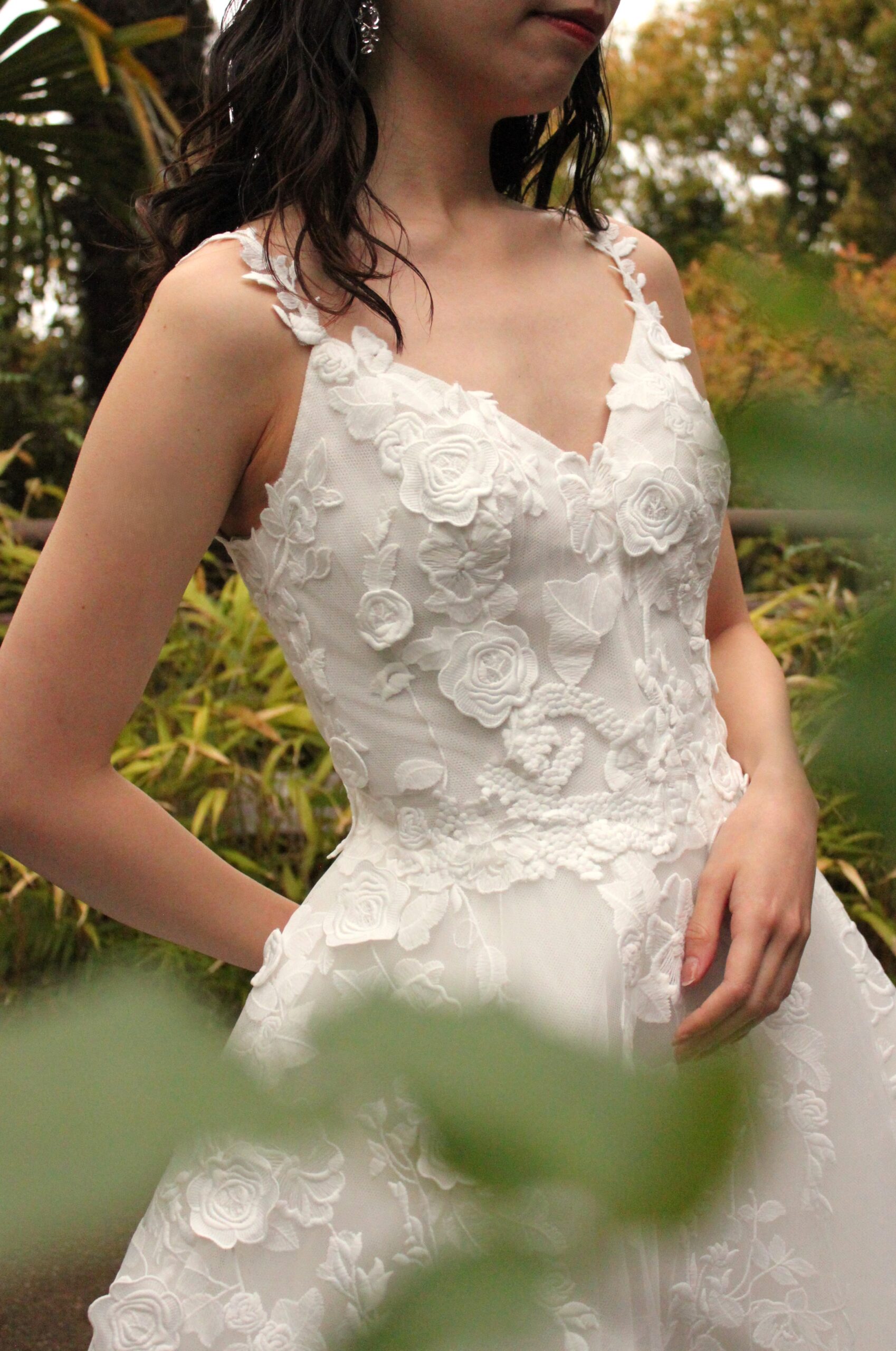 まるで本物かのように咲くローズの3Dフラワーが目を惹く、ロマンティックなプリンセスラインのウェディングドレスは、あえて均一ではないローズの3Dフラワーを全体のバランスを見ながら施しています。エレガントなローズのフラワーを纏う花嫁の佇まいは贅沢でゴージャスさのある印象に。3Dフラワーのローズが満開に咲き誇るその姿は、花嫁の一生に一度の特別な時間をより幸福感高く溢れるひとときにしてくれることでしょう。そして女性なら誰しもが一度は憧れを抱くふんわりと広がるプリンセスラインのシルエットで花嫁を女性らしい佇まいへと昇華させます。ウエストラインまではお体にフィットし華奢でタイトなコルセットライン、さらにドレスらしさを感じられる長いトレーンは大きく広がり女性のしなやかな曲線美をふんだんに活かせます。フロントデザインとは打って変わりバックスタイルはゴージャスで、主役感を感じることができとても贅沢で特別な一着に仕上がるのです。キャミソールにまで施されたリーフモチーフは、ゴージャスな印象を少し和らげるようモダンさをプラスします。主役感はそのままに、ゲストの皆様とリラックスしてお過ごしになる、アットホームでカジュアルなパーティにもおすすめの一着です。あえてヘアセットは愛らしいスタイルになるよう緩やかなダウンスタイルに仕上げ、耳元にはシルバーの煌めきが美しいイヤリングを合わせ、より清らかなコーディネートへと完成させるのはいかがでしょうか。
