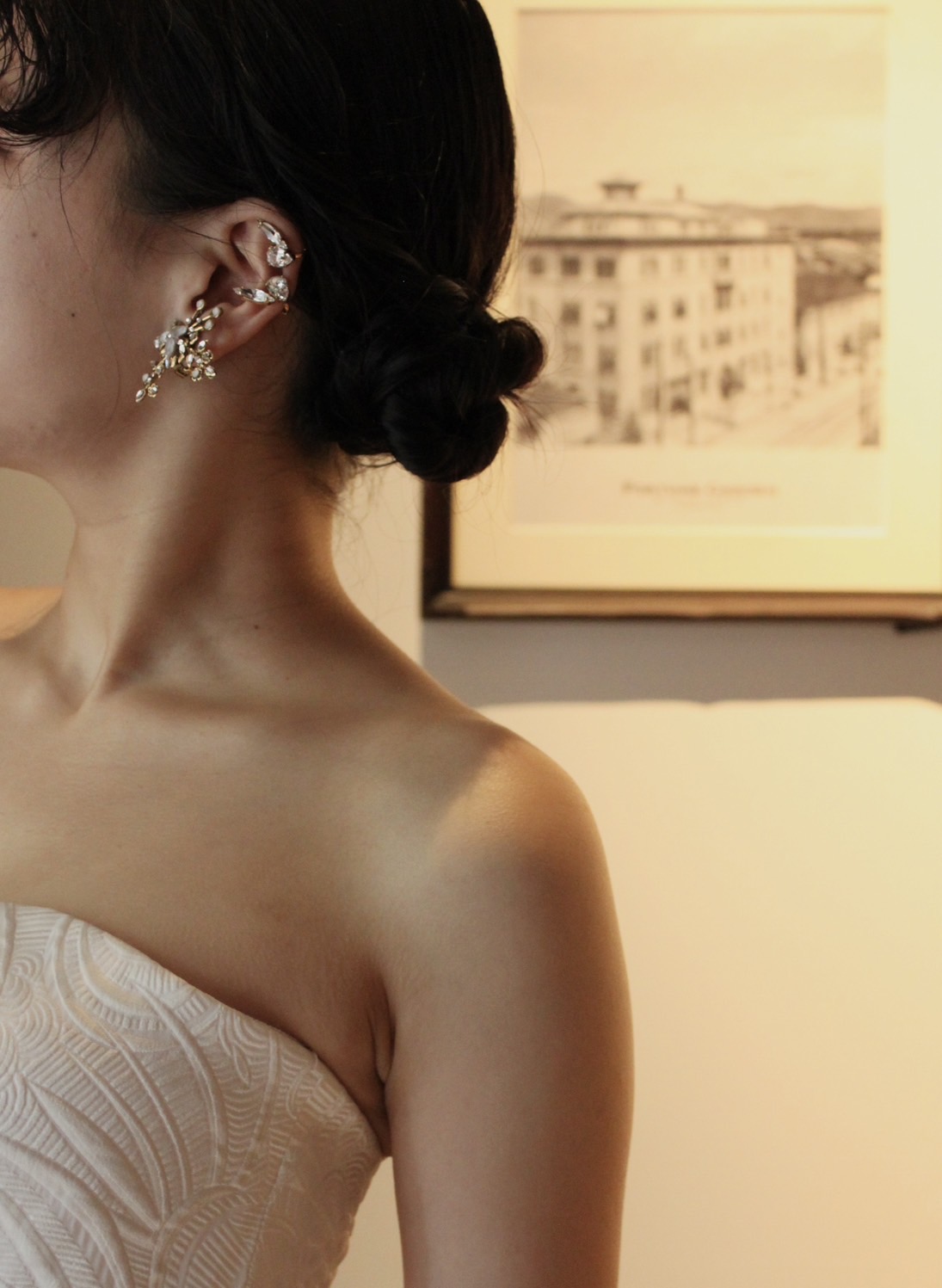 上質でかつ遊び心のあるナイーム カーンのウェディングドレスには、トレンド感溢れるラグジュアリーなコーディネートがおすすめです。ヘアはピタッとまとめたシンプルモダンなスタイルに。一つのシニヨンではなく、あえてツインシニヨンにすることでお洒落で個性的な花嫁へと昇華してくれます。そのキャッチーなお姿は、きっとゲストの記憶にも残るはず。耳元にはデザイン性のあるゴールドのアクセサリーを合わせ、本来イヤリングで使用するものをイヤーカフのように付けファッショナブルな印象に。あえてアシンメトリーにすることで他の人とは被らない、あなただからこそのコーディネートを叶えていただけます。ミニマムながら細部までこだわりが詰まったこちらのコーディネートは、ディティールまでこだわるナイームカーンのウェディングドレスの美しさをさらに引き立てることでしょう。ドレスだけでなくトータルのコーディネートであなただけのブライズスタイルを作り上げてみてはいかがでしょうか。THE TREAT DRESSING(ザ トリート ドレッシング)ではアクセサリーも一点一点セレクトしておりますので、ぜひそちらもお楽しみください。