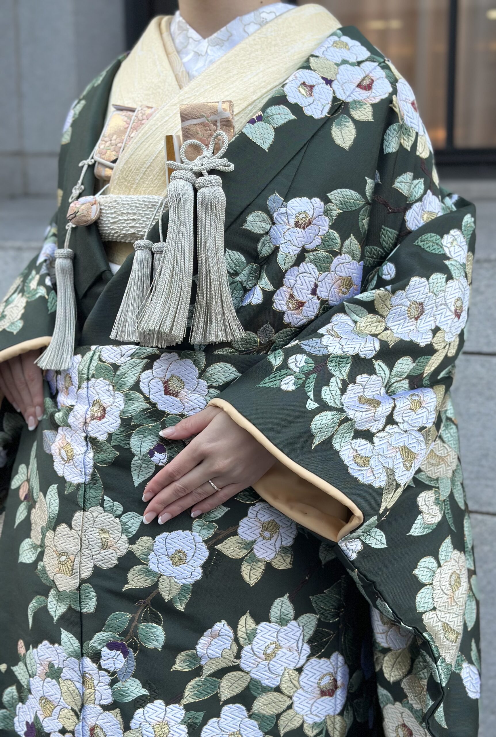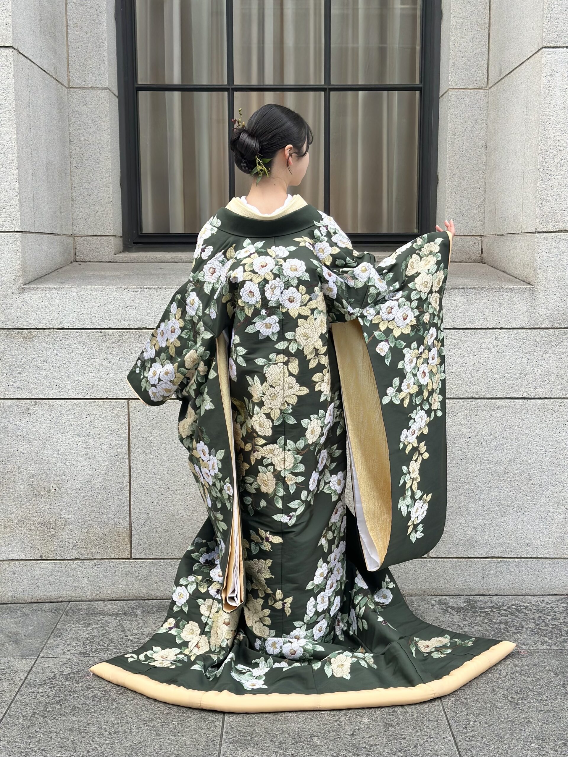 〜白椿が贅沢に施された暗緑色の色打掛〜