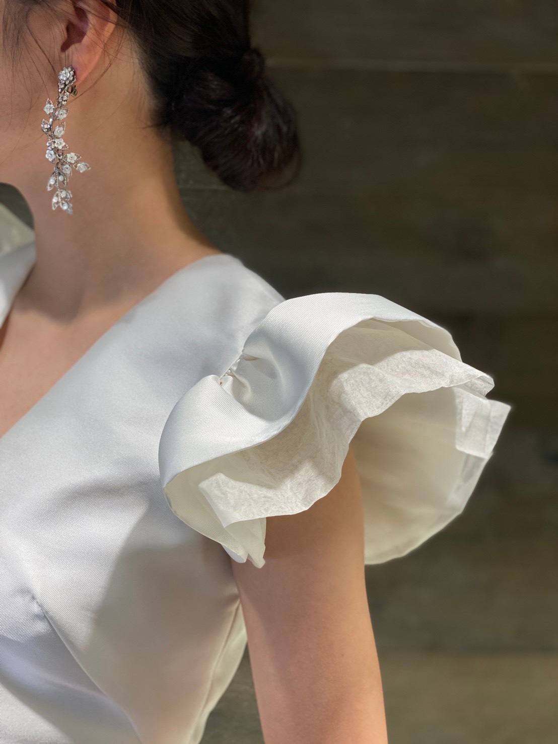 艶感のあるサテンの生地に、アイキャッチなフレアスリーブがアクセントを加え