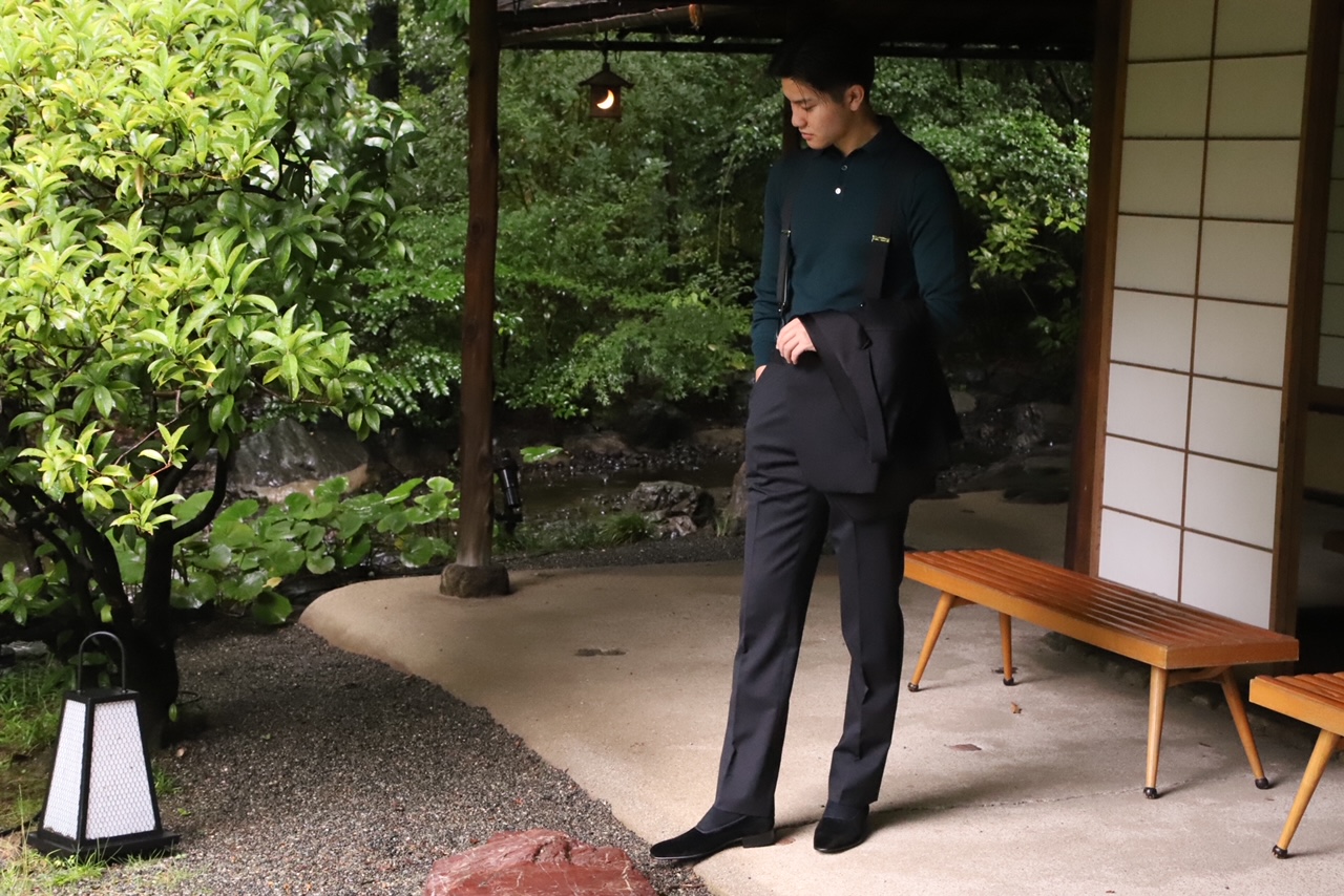 カジュアルすぎない演出として、綺麗めのニットポロを合わせることにより、男性らしさを兼ね備えたままドレスダウンを可能にします。フォーマルなタキシードとビジネス感の強いシャツを合わせると緊張感が出てしまい、またTシャツを合わせるとカジュアル感が強調されてしまいます。そこであえて首元のボタンと襟のあるポロシャツにすることで硬すぎないドレッシーなスタイルに昇華します。ブラックのタキシードにボトルグリーンの色味を合わせることにより、遊び過ぎず上品なカジュアルスタイルが完成します。ラフなシーンではジャケットを脱ぎ、サスペンダーのスタイルでさらにカジュアルな印象に。