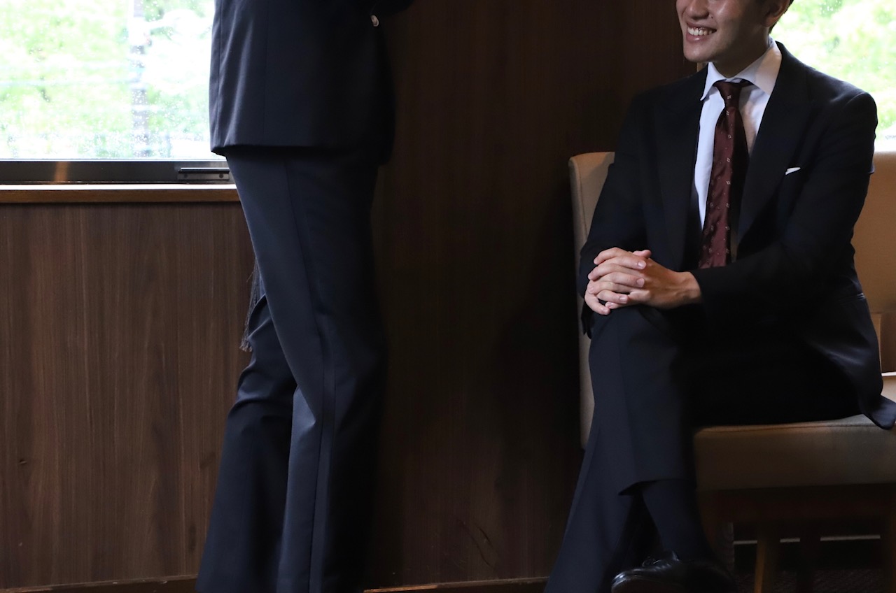 前回の記事はタキシードを用いたリラックスしたスタイルのご紹介でしたが、今回は胸元に特徴的なプリーツがあしらわれたエレガントなシャツを合わせたドレッシーなコーディネートをご提案します。首元には蝶ネクタイではなくストールを合わせドレスダウンすることで、緊張感を和らげ華やかさを演出。結婚式が結び、お二人の新しい生活が始まった1年後、初めての結婚記念日にレストランでのお食事でお二人のかけがえのない瞬間を祝福するのはいかがでしょうか。ぜひ色褪せない思い出の詰まった1着に身を包み、より特別な時間にしていただきたいです。