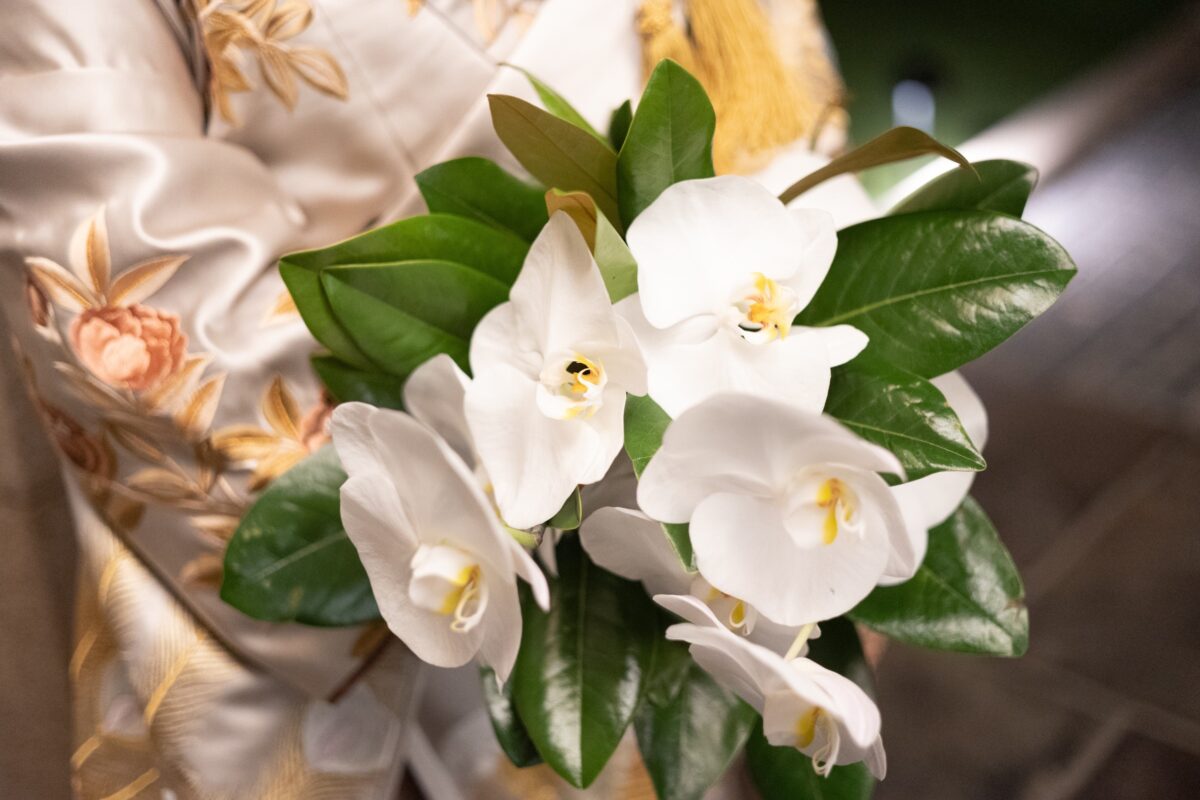 掛下や半衿、草履など和装には欠かせない小物。今回作成したオリジナルの色打掛は小物までこだわりデザインを考えました。小物にも芍薬や孔雀の羽根のモチーフが描かれており、こちらも全て職人の技法が生かされた日本の伝統の美しさを感じられるものばかり。柔らかなピンクベージュやペールトーンの色味で仕上げられた小物は新婦様を優しく包み込みます。髪飾りにはemi takazawa(エミ タカザワ)の刺繍花を贅沢に2つ組み合わせることで華やかなコーディネートに。こちらの刺繍花も日本の伝統産業である横振り刺繍によって作られた手の込んだ髪飾りです。刺繍で花びらを作り出し、それを一つ一つ花の形に組み合わせ一つの刺繍花を完成させます。刺繍花にはそれぞれ名前が付いており、今回選ばれた2つは秋子と月泪というデザイン。絹糸で作り上げられた艶のある光沢感が上品さをプラスしてくれます。柔らかいベージュやゴールドの色味が色打掛と合わさり、統一感を出してくれますね。色打掛と髪飾りの色味がお好みと仰る新婦様の手元には、こちらも統一感のでるグレーやピンクベージュのネイルをセレクトし、指先にまでこだわったコーディネートに。ブーケには会場装花にも使用されていた胡蝶蘭をセレクトし、新婦様だけのコーディネートを楽しんでくださいました。そんなこだわり抜いた新婦様の横には紋付袴を身に纏った新郎様。はっきりと締まる色味が新郎様を凛とした印象にさせ、淡い色味の色打掛とバランスの取れたスタイルに。袴にも格があり、新郎様は第一礼装とされている黒羽二重五つ紋を選ばれました。人生の中で着物を着る機会は限られているからこそ、特別な1日に和装で過ごすお色直しスタイルも素敵ですね。